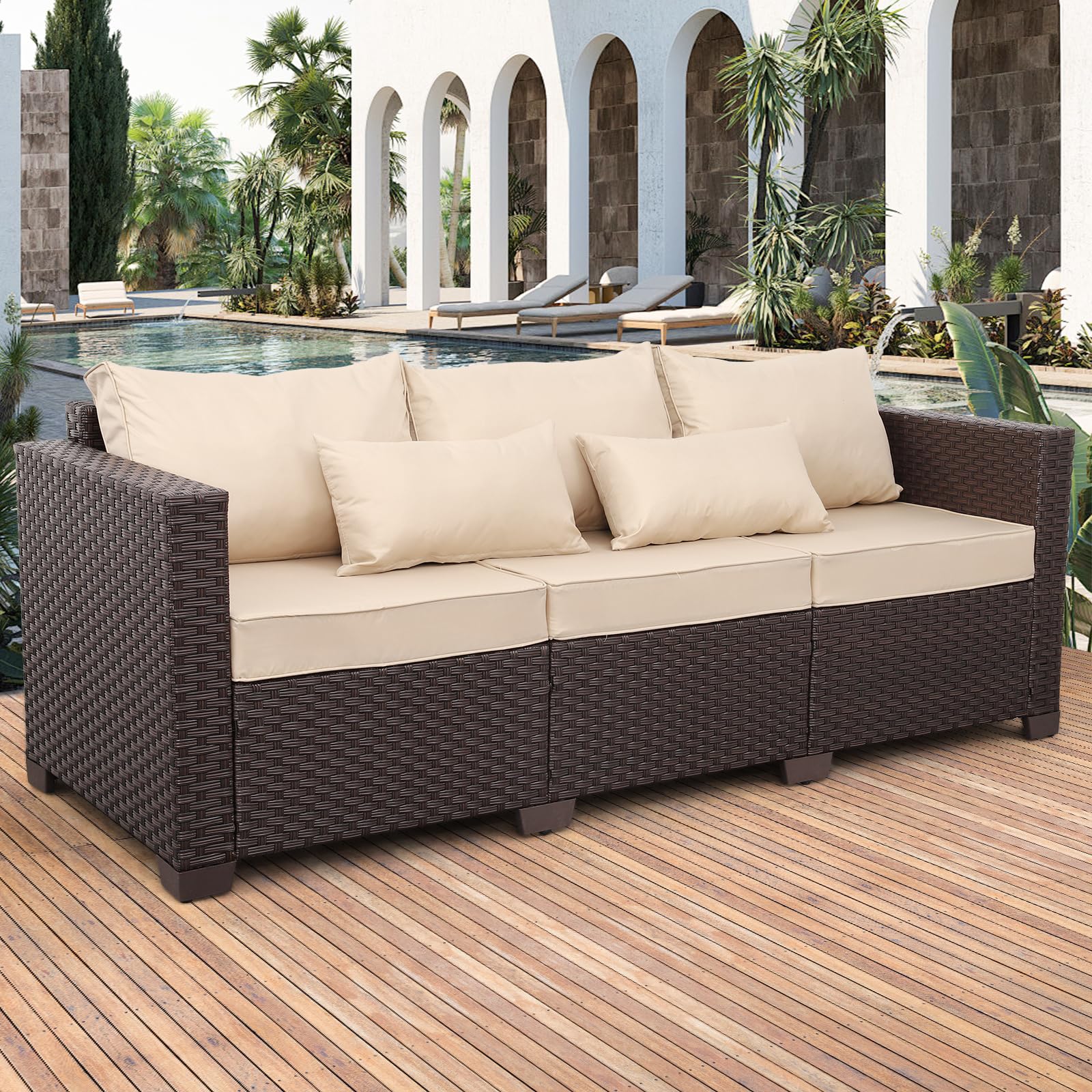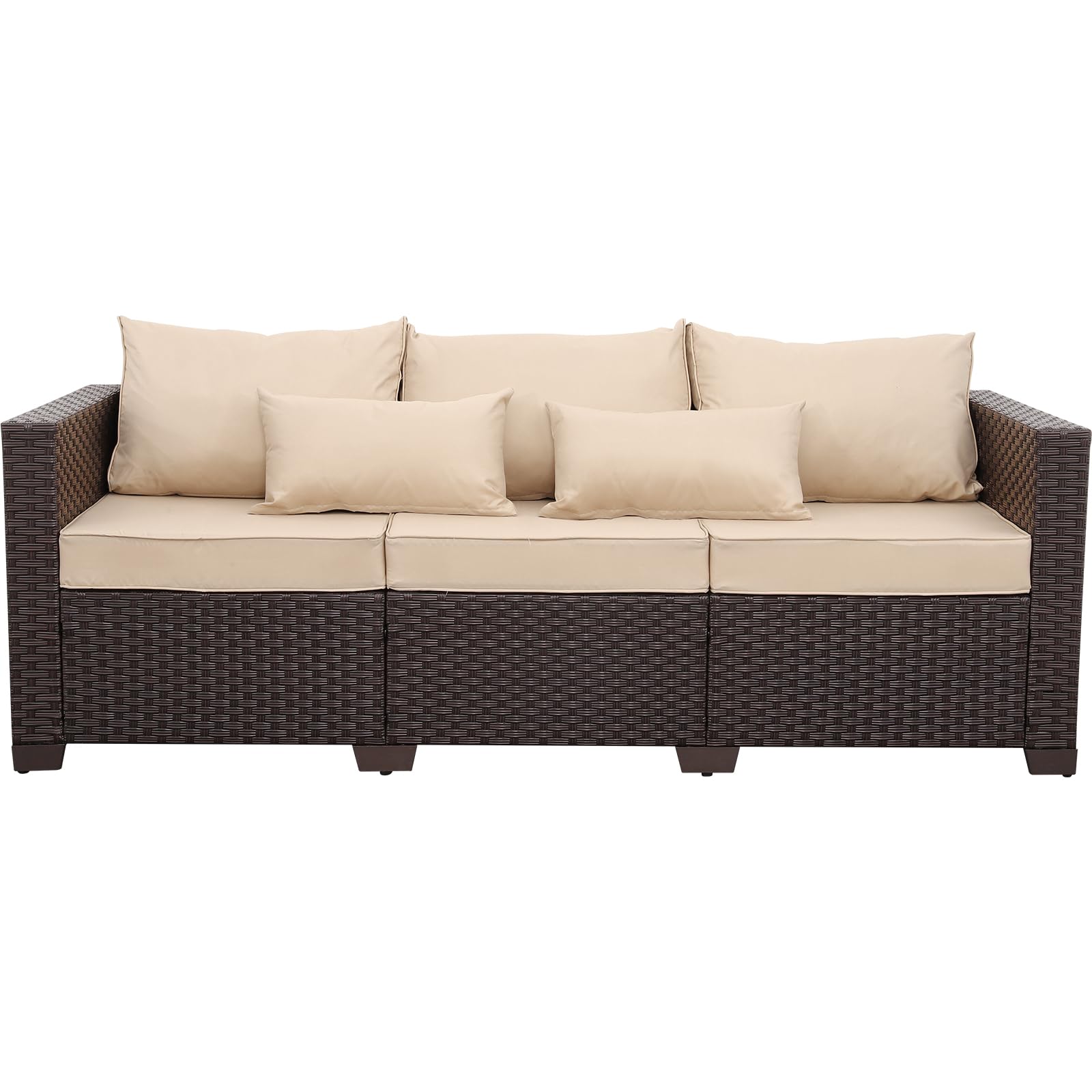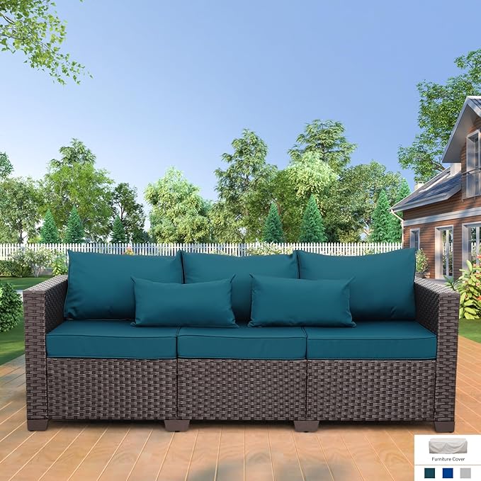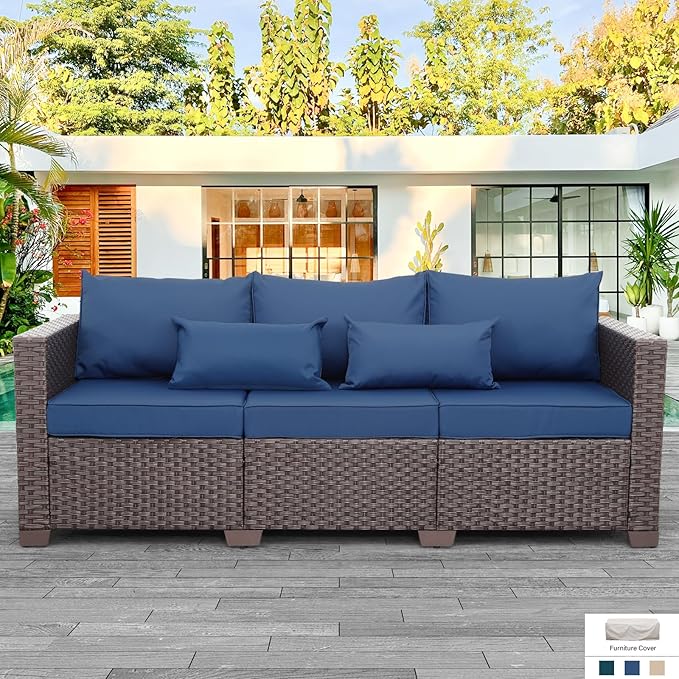 - Quality and Maintain: This 3-seater couch is made of an all-weather HDPE wicker and rust-resistant steel frame, which ensures long-term use. Breathable 250G polyester fabric is water-repellent, UV-resistant, easy to replace, and washable. With a complimentary waterproof furniture cover, do not worry about rust, dust, water, or fade
