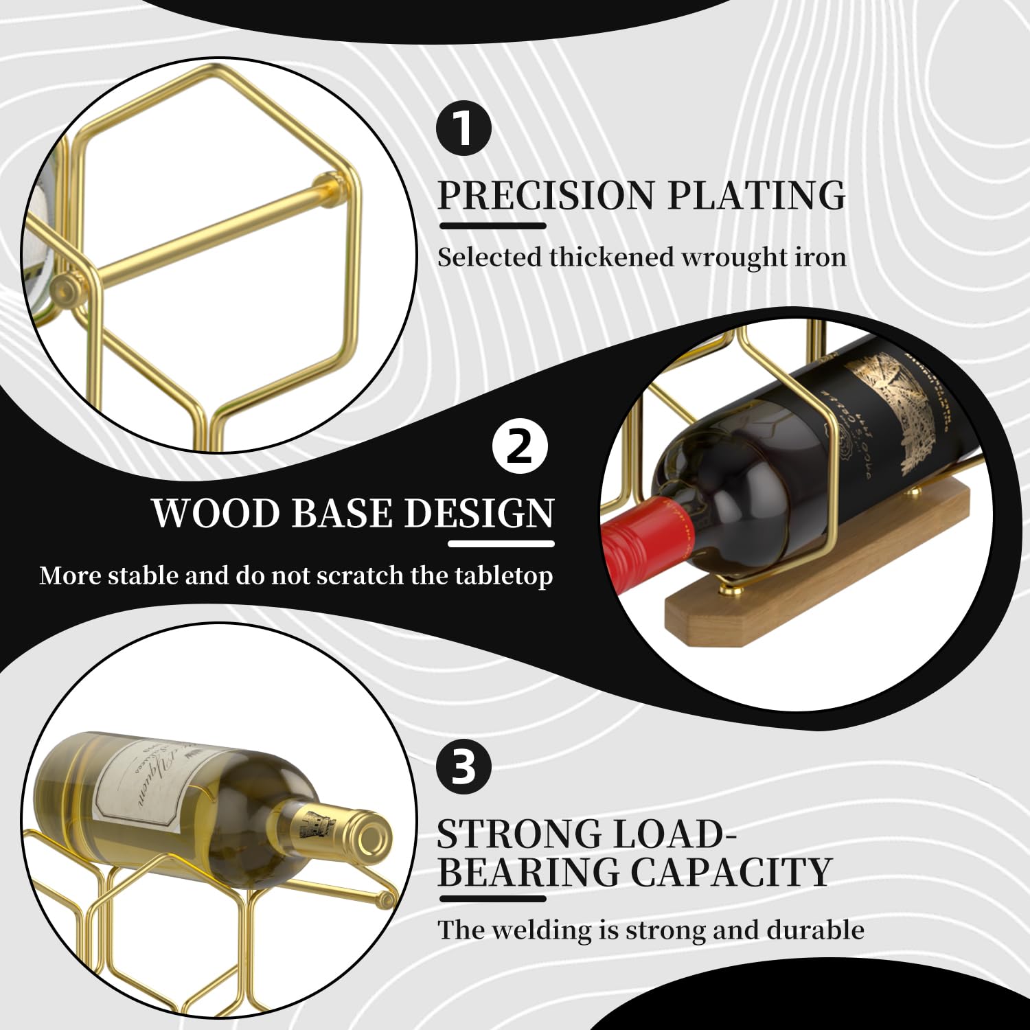 - Crafted from high-quality wrought iron and wood materials with a plating finish, our table-top wine rack is built to last. Say goodbye to bending, scratches, or fading common with traditional paint finishes. This wine bottle holder is exceptionally sturdy, ensuring it won't wobble, tilt, or fall, providing a reliable, long-lasting storage solution.