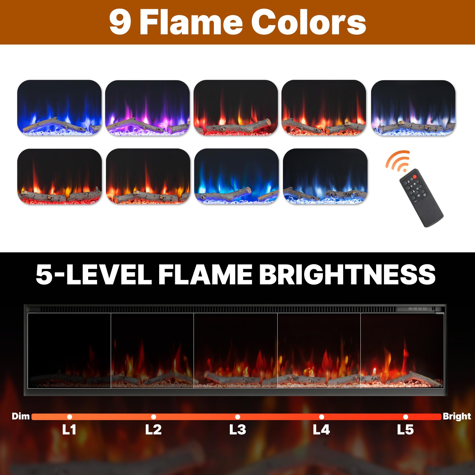 - This electric fireplace tv stand features a stunning 60-inch fireplace insert with adjustable 9 colors and 5 brightness levels. Its temperature ranges from 62℉ to 82℉, offering cozy warmth. The realistic 3D flame effect adds charm, and the included remote control ensures effortless operation.