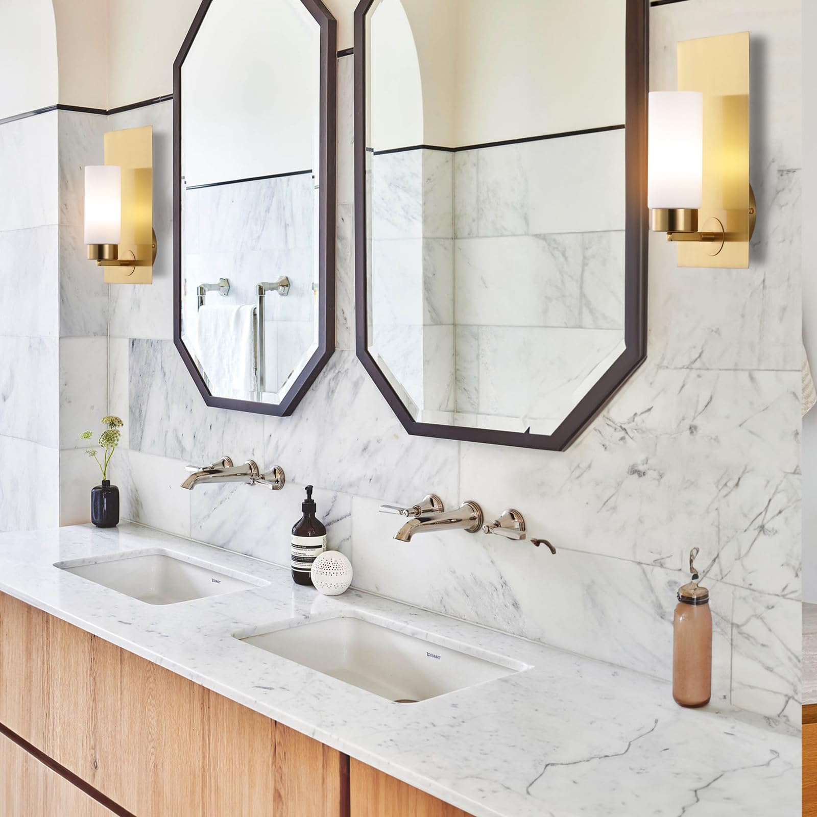 - This bathroom vanity wall light is featuring a cylinder shaped milky white glass shade with the brushed brass square metal base,chic and elegant, Ideal for indoors as a bathroom sconce, a farmhouse vanity light, bedroom bedside, kitchen, living room, restaurant, coffee room, office, exhibition, corridor ,foyer, etc.