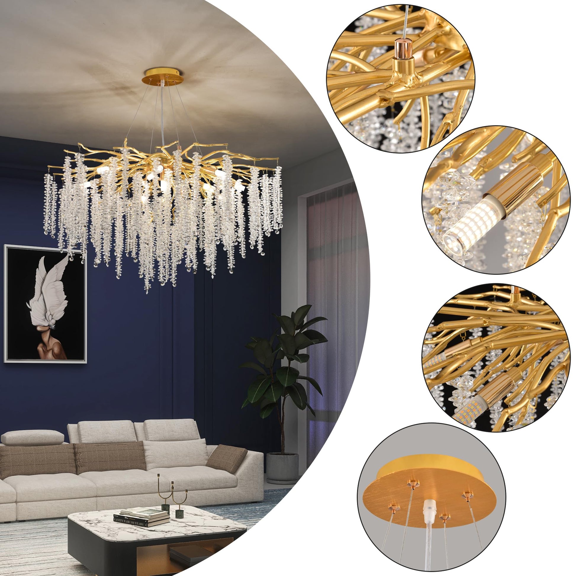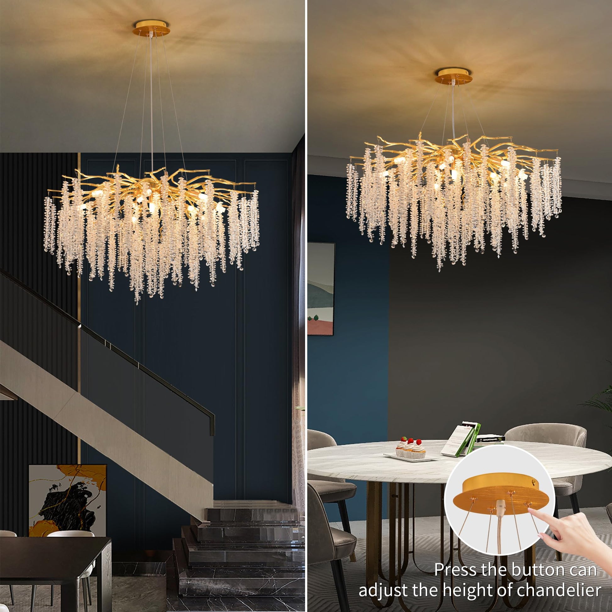 - Crystal Tree Branch Chandeliers:The chandelier branches with metal finish plating process, corrosion resistant, rust proof, Gold finish thickened and encrypted branches, the branches can be manually adjusted,The gold finish adds a warm shine to the sparkly glow from the crystals string that drip from the branches of this light fixture.