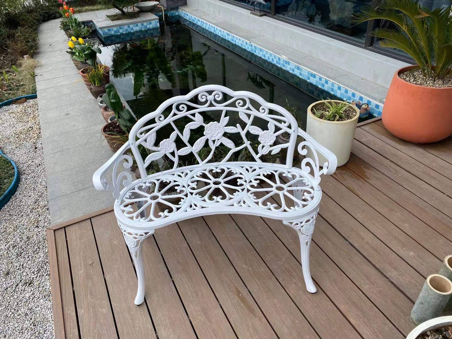 Add both style and comfort to your patio, balcony, or garden with this durable cast aluminum bench—a perfect blend of beauty and practicality.