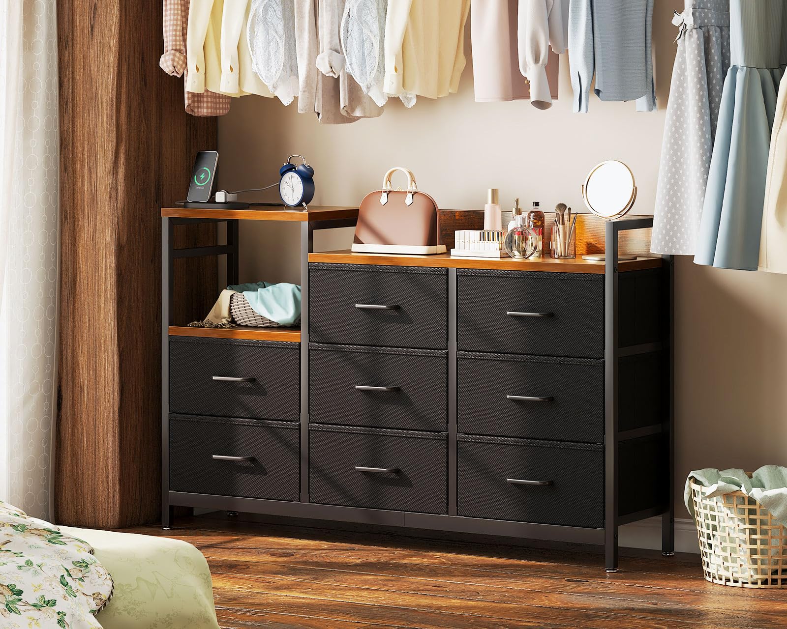 - Equipped with a built-in power strip featuring 3 AC outlets, 2 USB ports, this dresser effortlessly charges all your devices