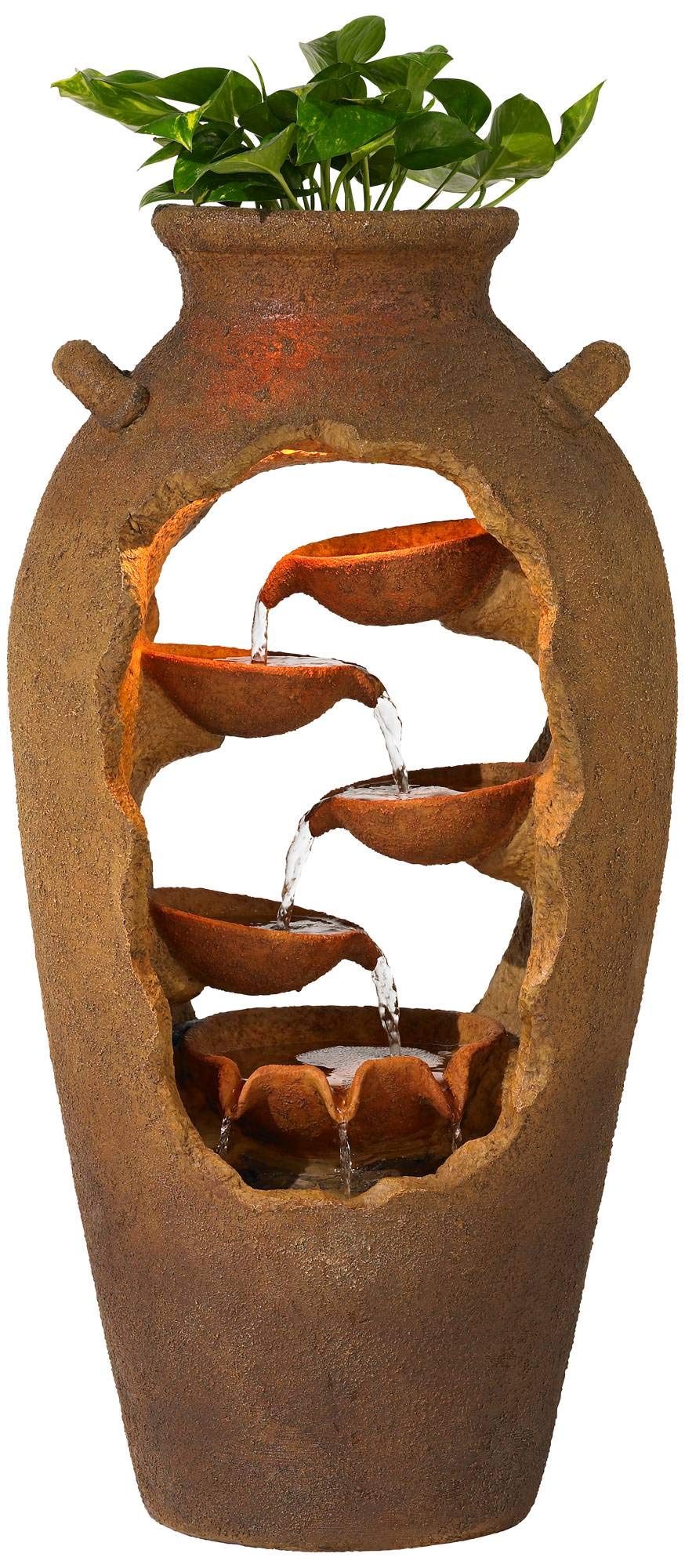 - A rustic urn or outdoor patio fountain enhances a backyard waterfall, while an outside fountain or bowl-style garden waterfall adds elegance to a patio water feature or backyard escape. LED cluster illuminates the inside of the fountain design at night. Built-in planter space at the top for a real or faux plantings.