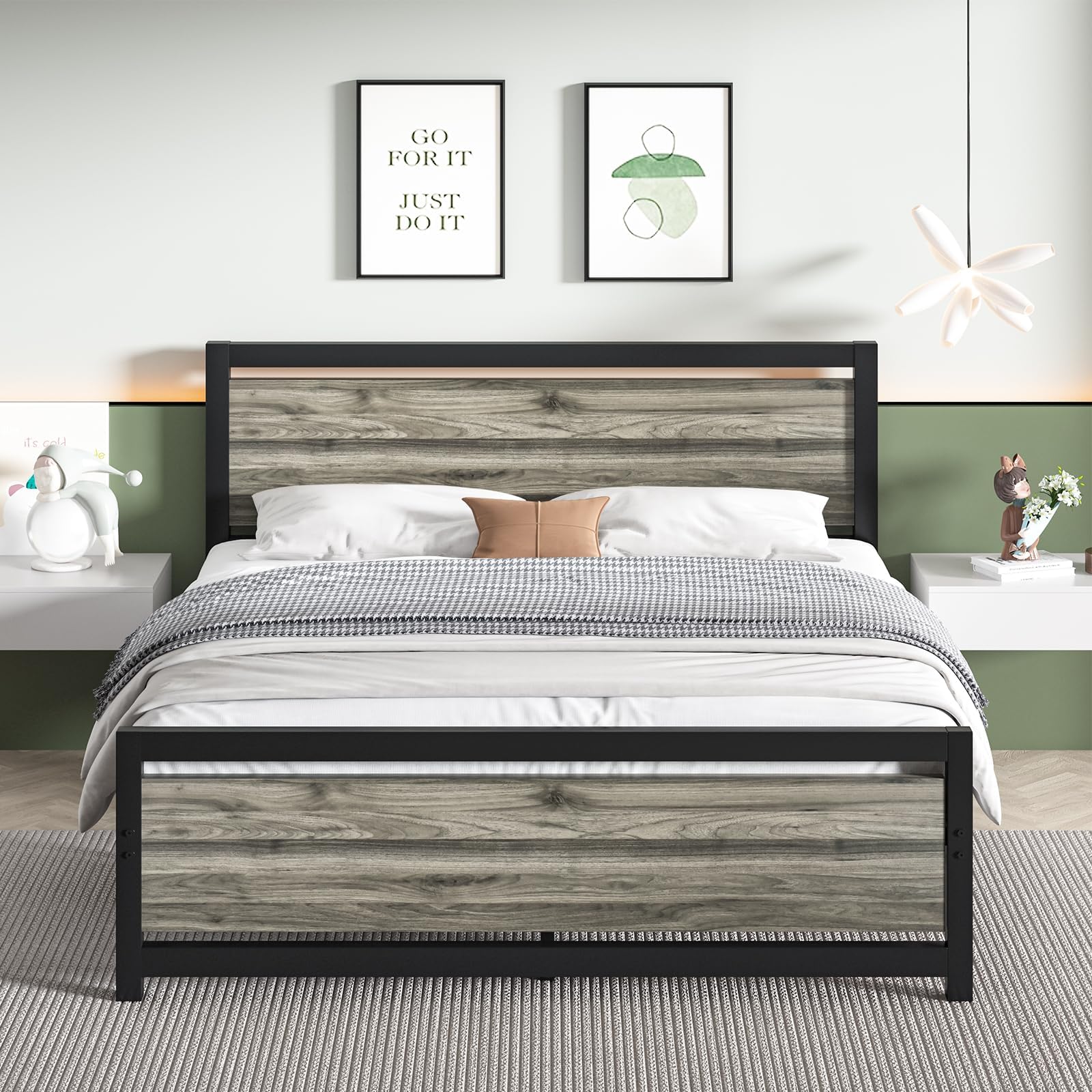 - Modern Industrial Style: Washed grey wood headboard and footboard mixed with black metal creates a strong industrial look and adds a unique charm to your room