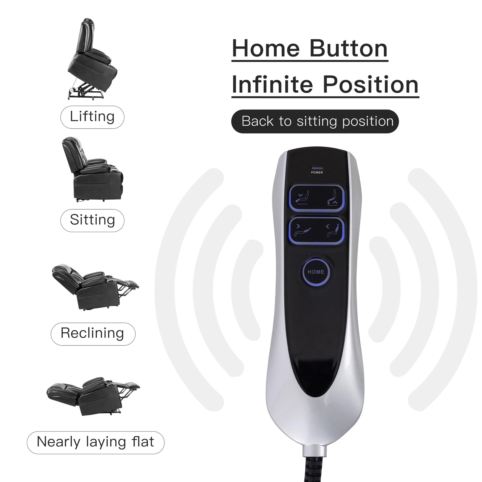 - The remote control features a home button, you can push it to have the chair automatically go back to its regular sitting position. This is a simple and straightforward design, very convenient for the elderly. Compared to other products that revert directly to the standing position, pressing the home button to switch to sitting position is safer and friendlier for elderly people, because they won't be at risk of falling.