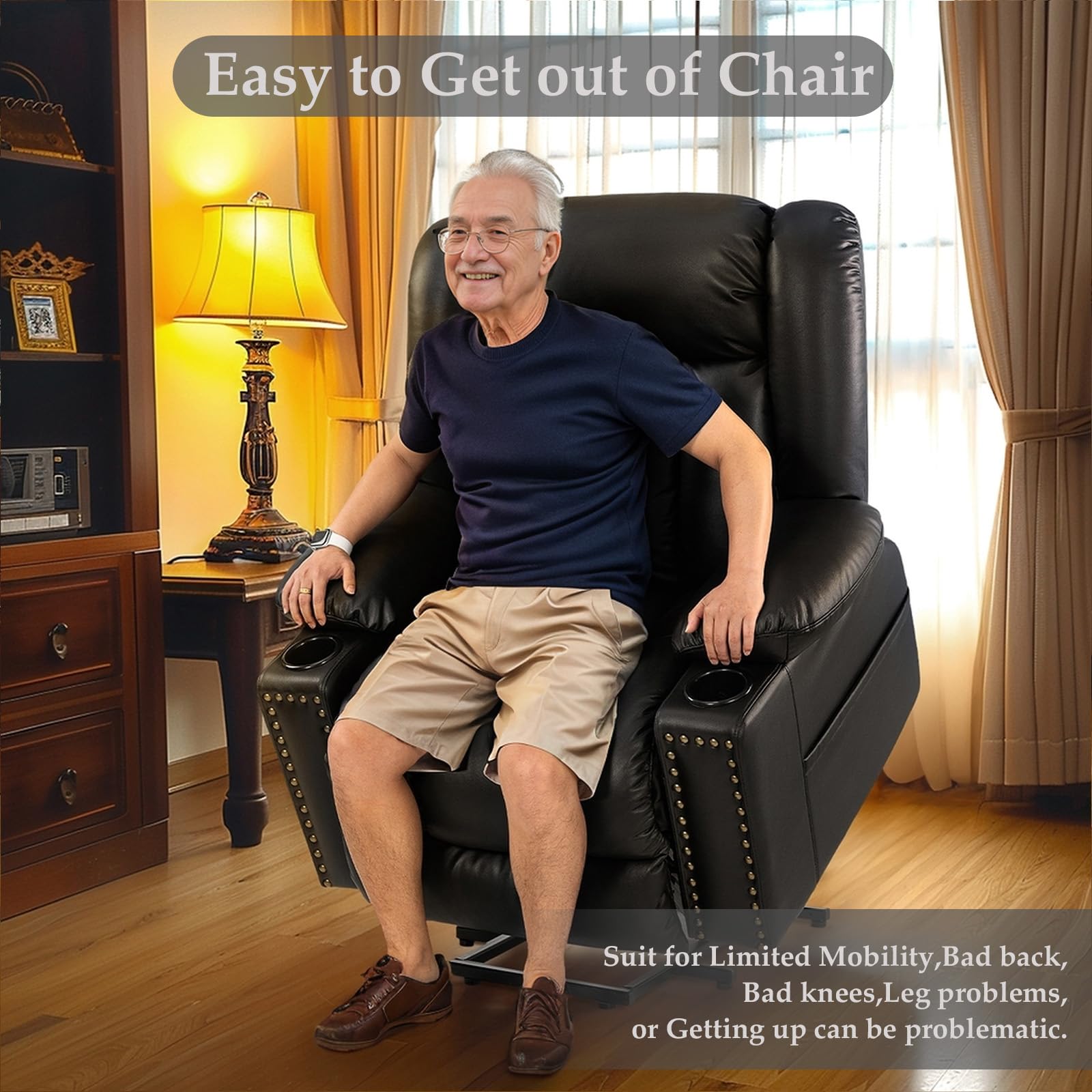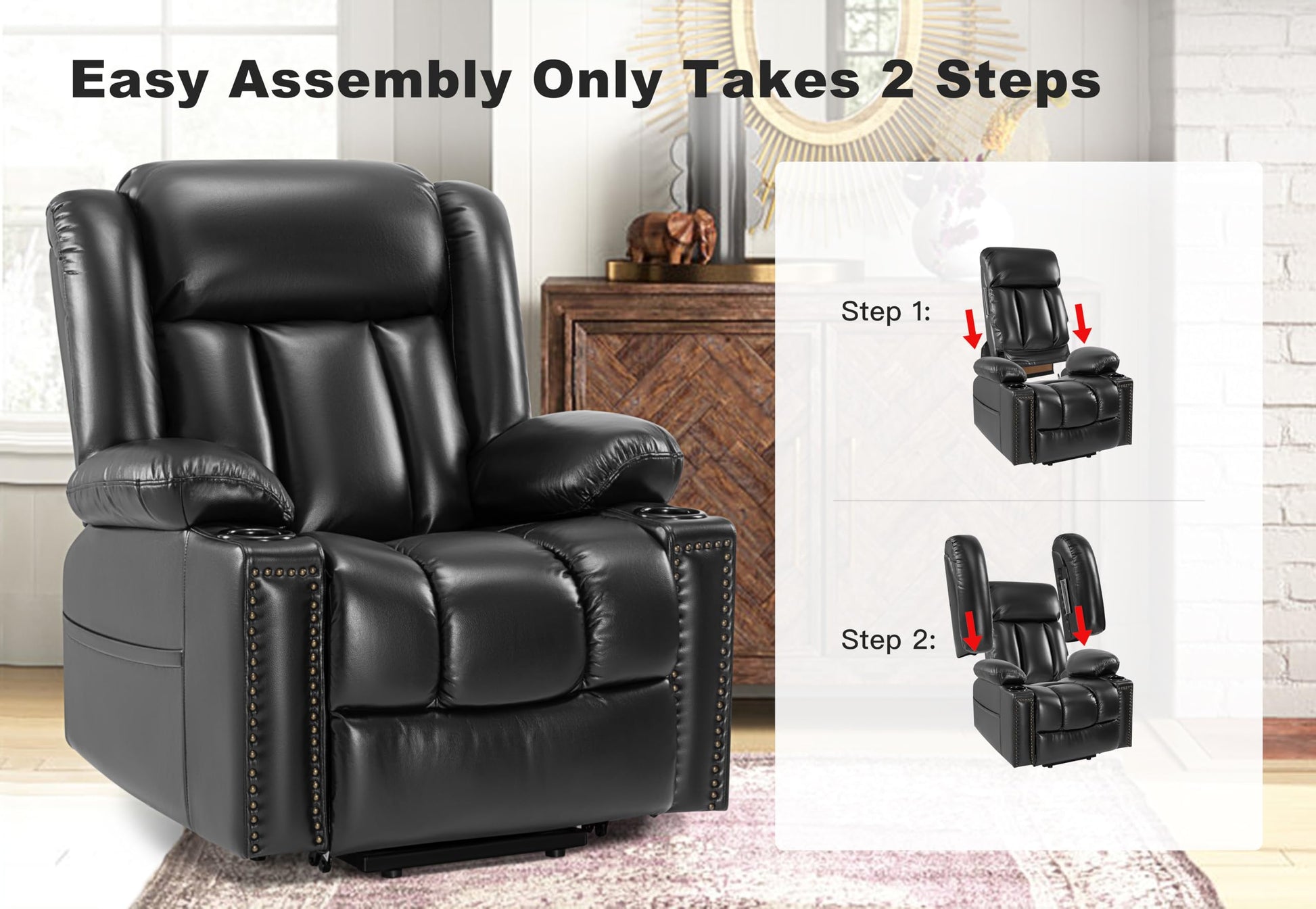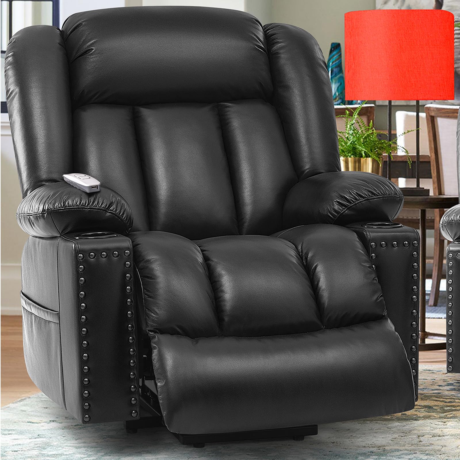 - Our power lift recliner has 8 vibrating massage points that correspond respectively to your back, lumbar, thighs and calves. At the waist, there is an automatic heating system. Dual cup holders on both sides of the armrests allow you to pick or place your cups easily with no need to get out of this chair. Built-in USB port on the remote control makes it easy to recharge your electronic devices. Two side pockets are also a great idea, which can hold many small items.