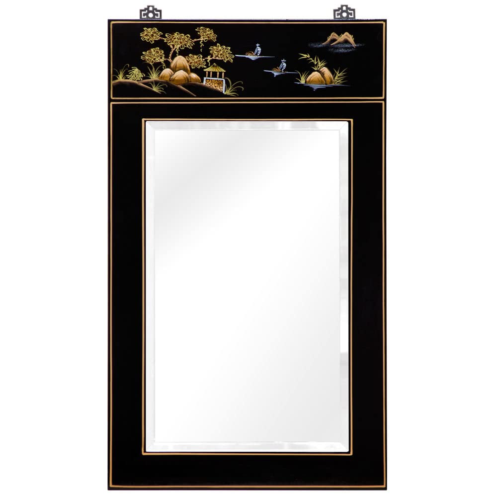 Black Lacquer Chinoiserie Scenery Motif Oriental Vertical Mirror