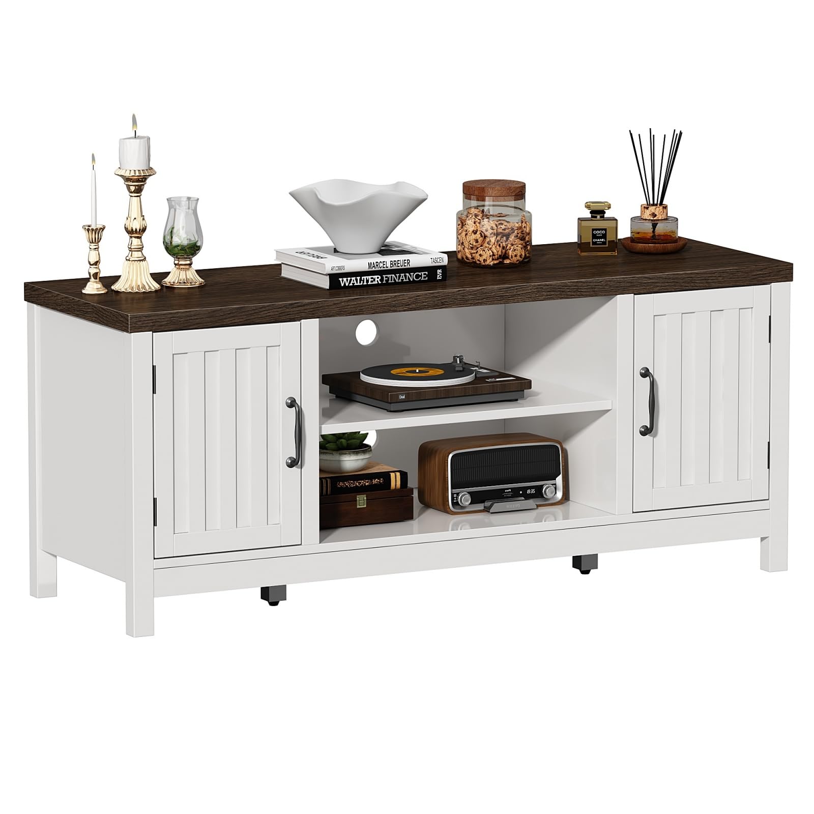 - With its classic white finish and natural wood tone tabletop, this TV stand exudes rustic farmhouse charm. Its smooth, clean lines create a cozy, inviting atmosphere that effortlessly enhances your living space, making it a perfect match for casual beach interiors