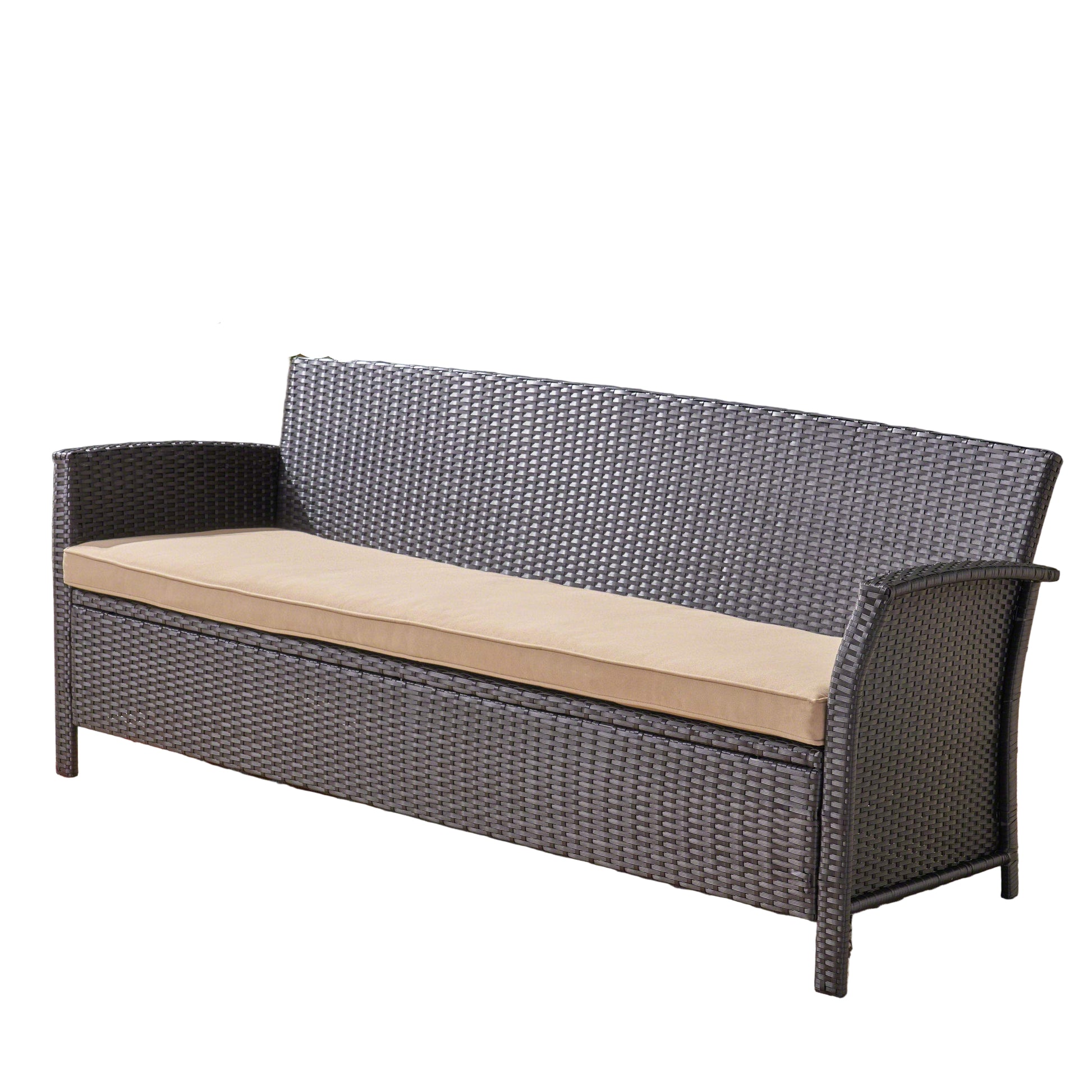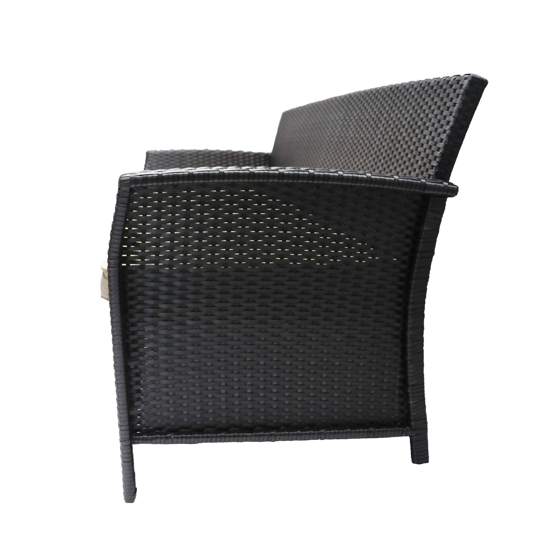 - Includes: one (1) sofa. Material: Polyethylene wicker. Cushion material: Water resistant fabric