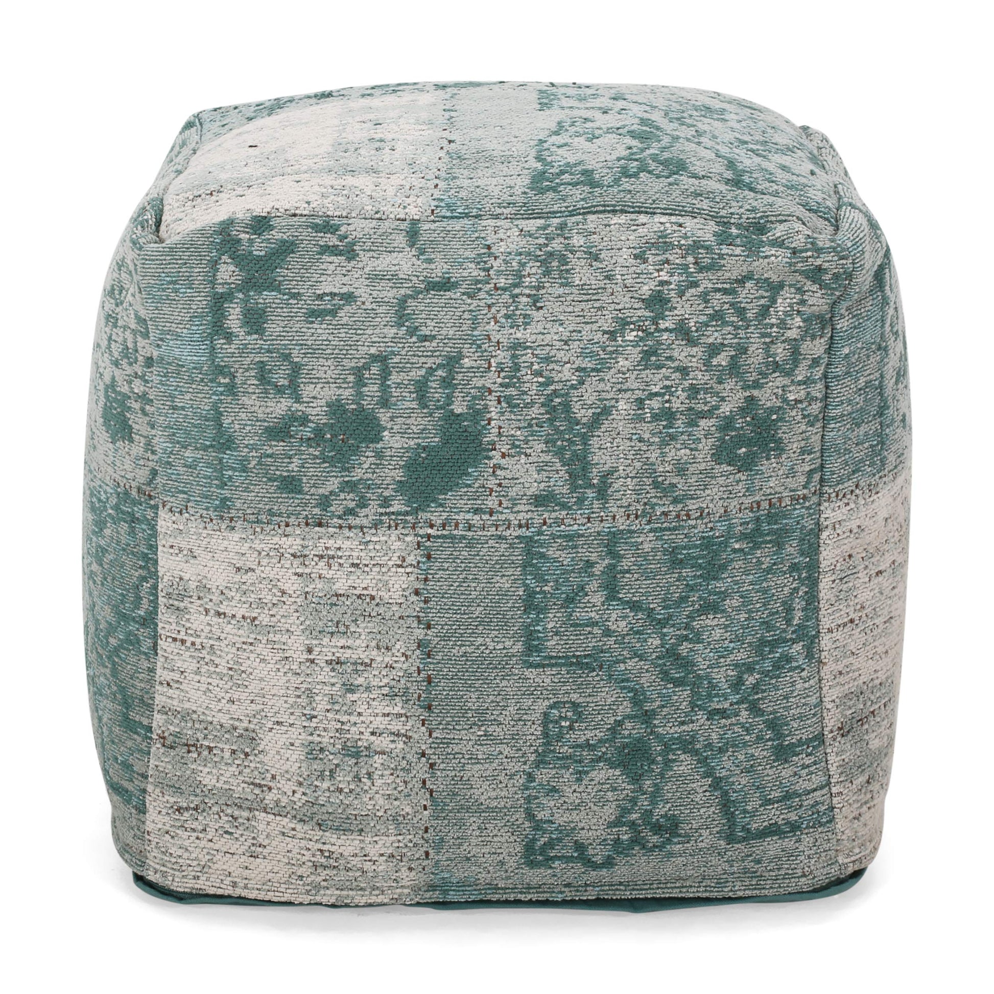 Hannah Hand-Loomed Boho Fabric Cube Pouf, Teal, Beige