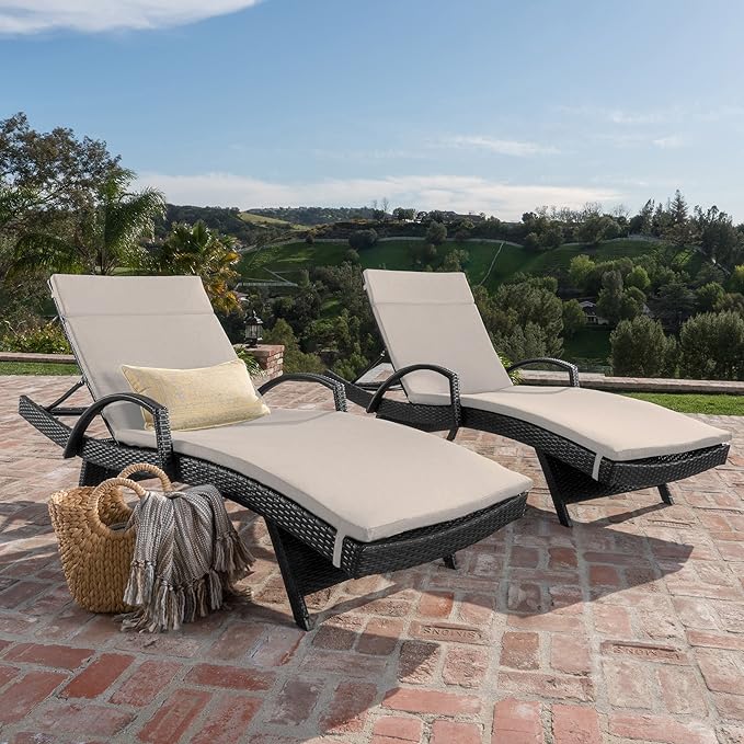 - Add some stylish comfort to your patio decor with this wicker lounge now with arm rests. Both the chair and cushion are weather resistant and with an adjustable back and folding legs for easy stacking. Available with select cushion colors.