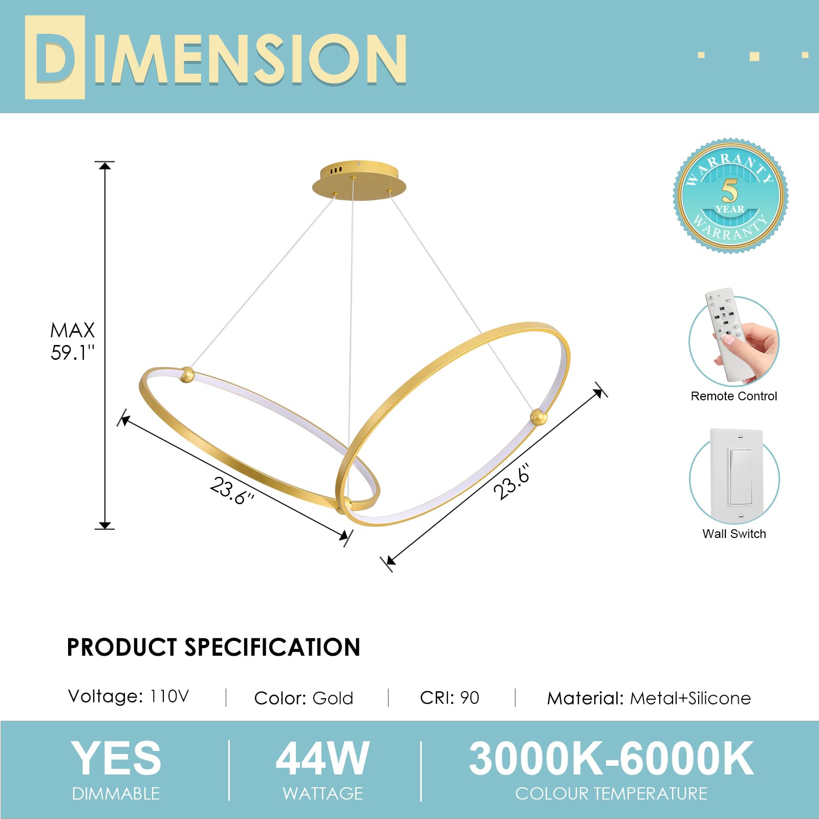 - CHANDELIER SPECIFICATION: Watt: 44 W, Volt: 110 V, Lumen: 3520 lm, Suggested space size: 110-160 sq.ft. Product size: D23.6" inches, Adjustable Max height: 59.1 inches, Color temperature: 3000K-6000K, Dimmable: Yes