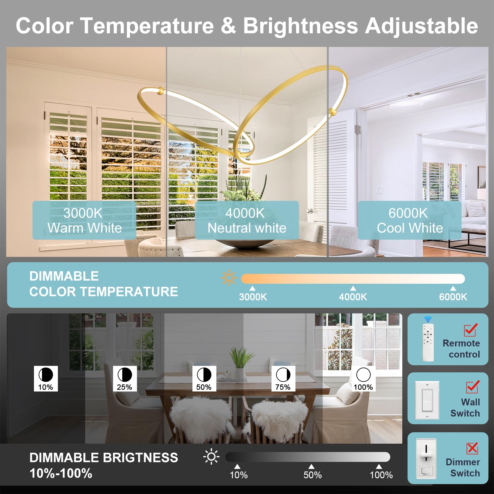 Gold Modern Chandelier Remote Control 2-Ring LED Chandelier Dimmable Pendant
