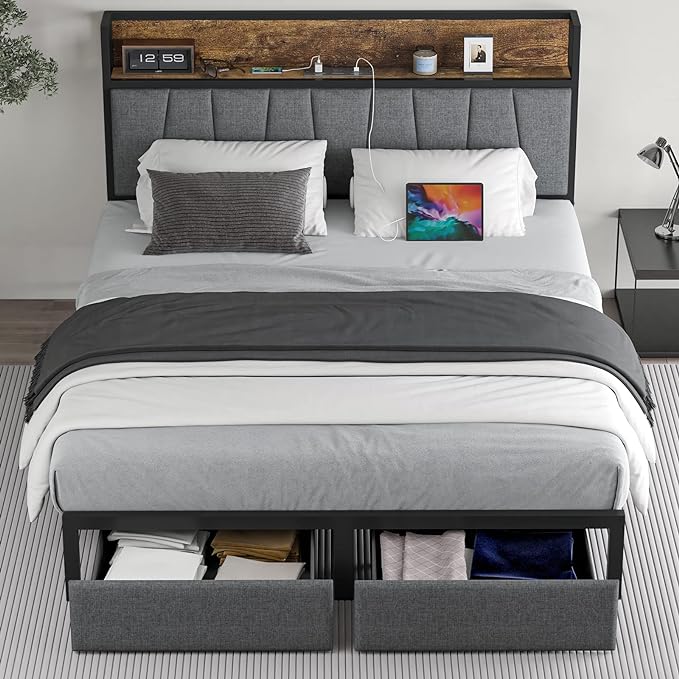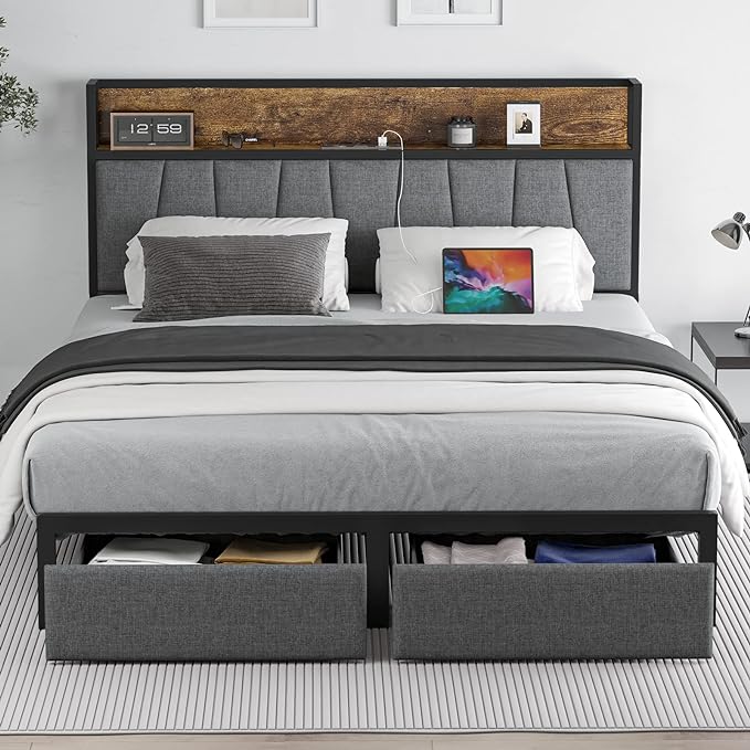 - The bed headboard is built-in with 2 outlets, USB, and 1 Type-C charging port. Convenient for you to place iPhone/Android and other devices on it. The queen bed frame with a storage shelf helps you easy to find your phone, turn off the alarm clock, and get stuff you need while enjoyably lying on the bed.