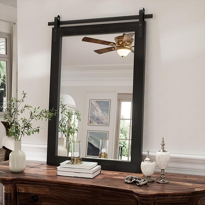 - EASY TO INSTALL The mirror features a barn door-inspired design. The installation method of the metal bracket can be freely played according to personal preferences.