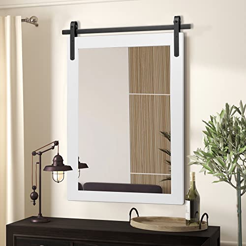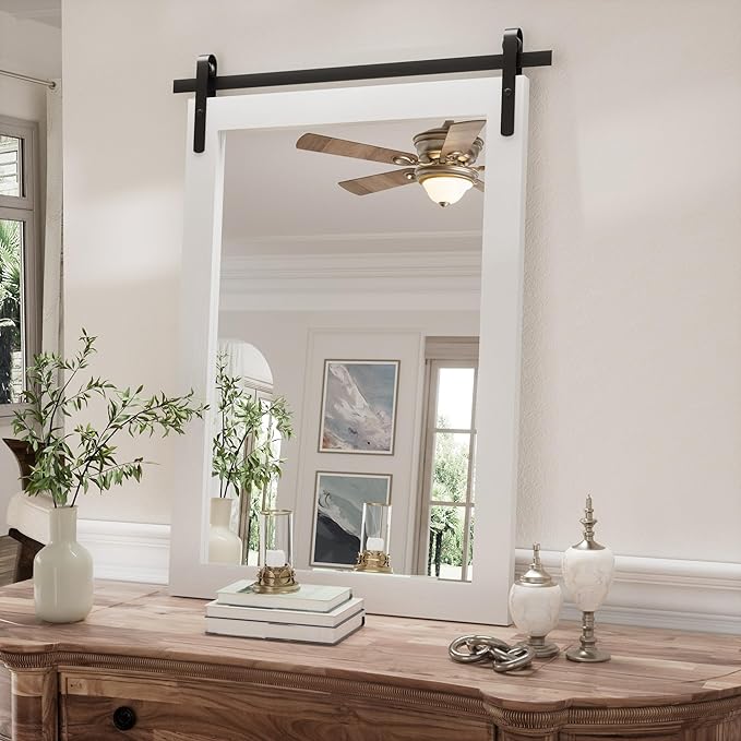 - WOOD FRAME This barn door mirror is made of wood frame in rustic white. Heavy-duty metal bracket adds speciality to the mirror.