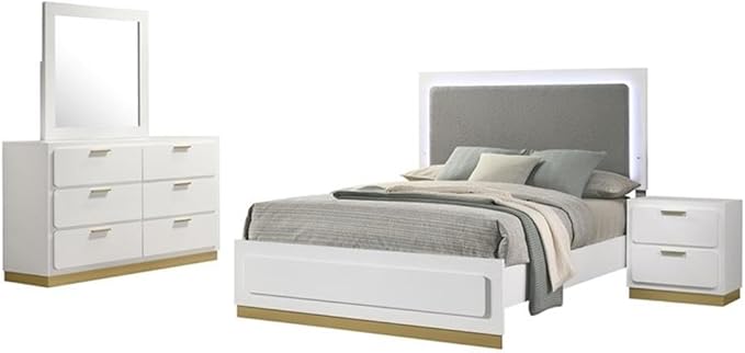 - Upholstered headboard with touch LED lighting highlights a four-piece bedroom set
