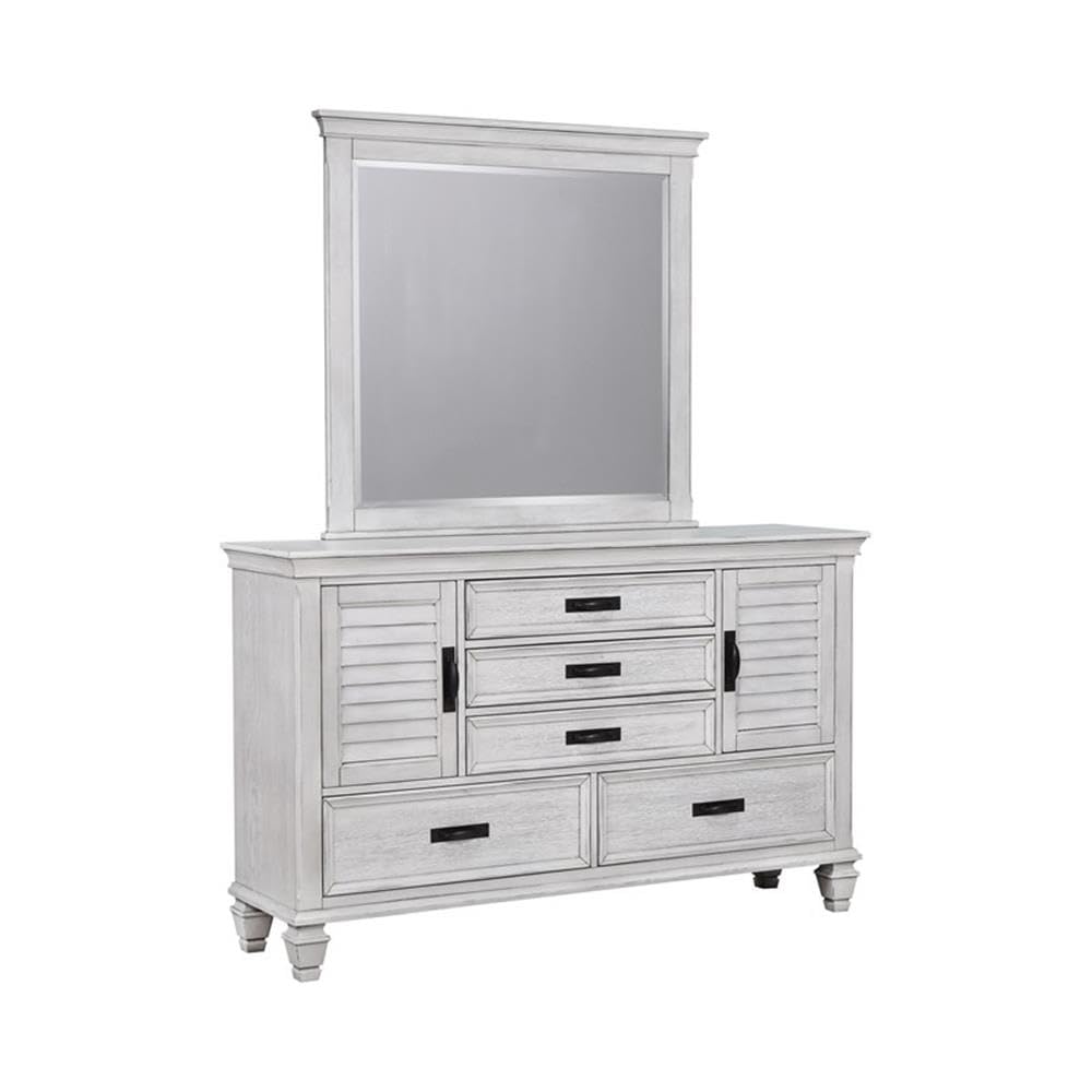 - Rustic with a tropical vibe, five-piece bedroom set comes complete with a platform bed, single nightstand, chest, and a dresser and mirror combo. A paneled headboard and footboard feature a shutter style design, as well as the dresser cabinets. This entire set also offers a subtle, wire-brushed finish that boasts a strong wood grain pattern. Extra details include a nightstand with a convenient pull-out service tray and cord access for charging handheld devices, as well as felt-lined top drawers and soft-closing drawer glides. Across the set, each drawer is adorned with a dark gunmetal hardware.
