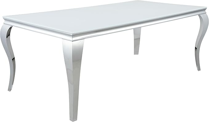 - Polished chrome finish table base features dramatically curved Cabriole legs topped with white tempered glass