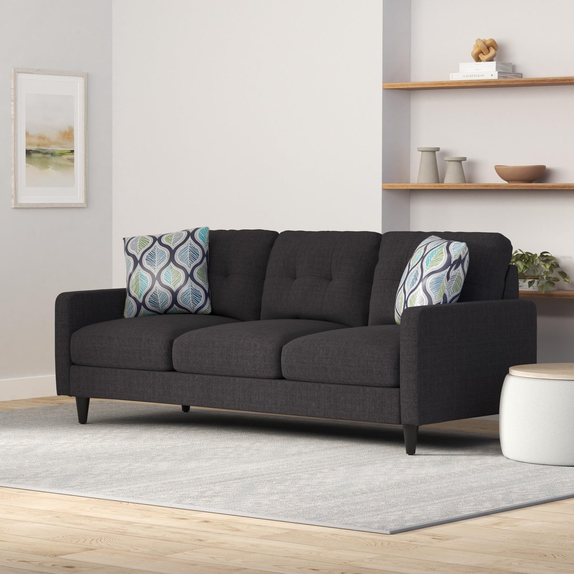 - [Textural charm] Defined by button-tufted seat backs, wrapped in soft dark gray fabric, this stationary sofa brings character to any living room or sofa for small spaces setting.