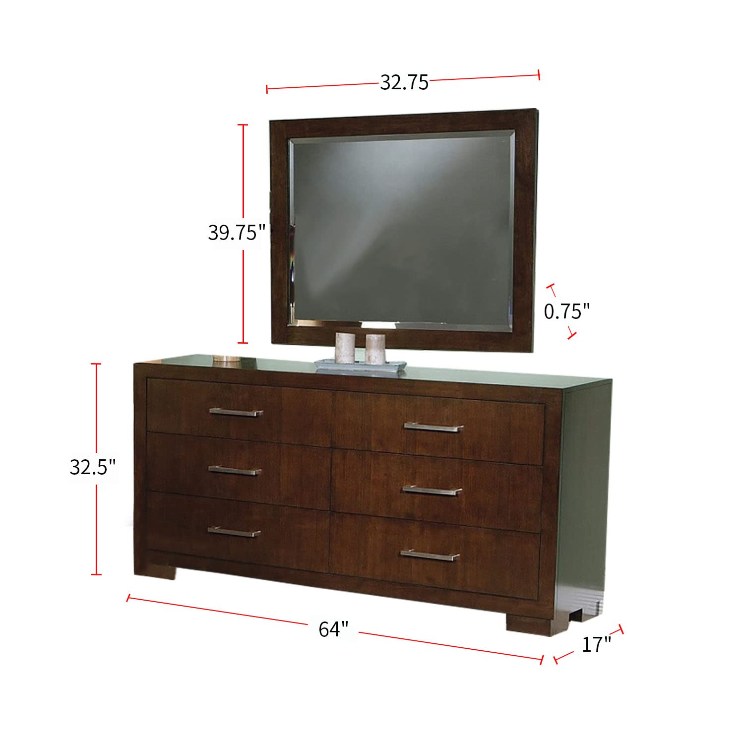 - This deluxe 4-piece bedroom set from the Jessica collection includes a dresser and nightstand. The stately bed is crafted in a platform style with smooth lines and crisp edges. The nightstand and dresser have deep drawers accentuated by lustrous hardware. An accompanying rectangular mirror goes atop the sturdy dresser to complete the set that's perfect for a well-appointed master bedroom. The entire set is fashioned from solid wood and ash veneers that's warmly finished in a rich cappuccino with an option for a white finish.