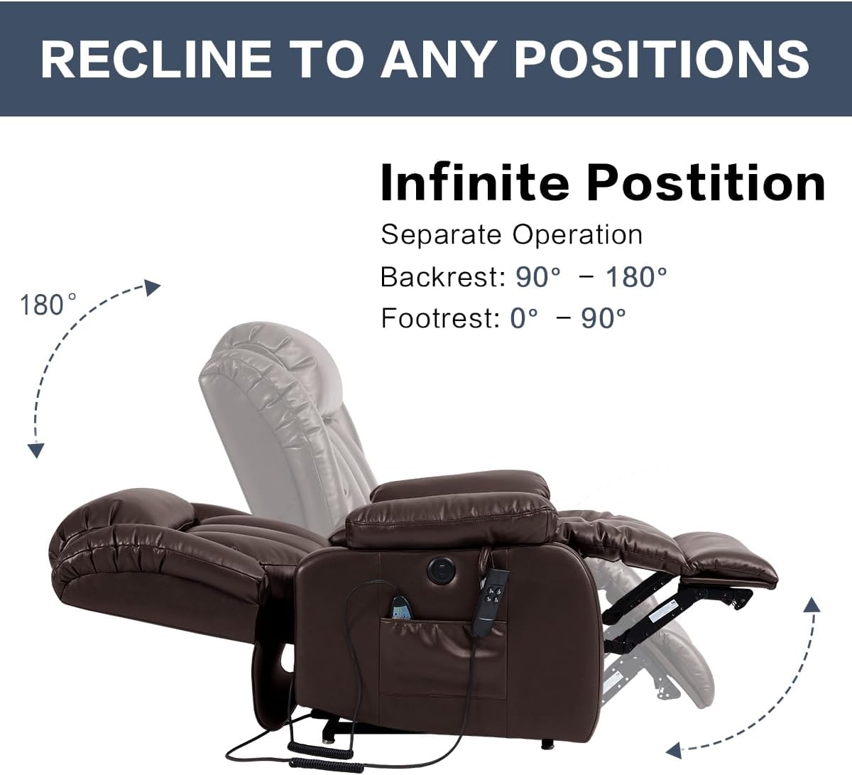 - INFINITE POSITION The backrest can be operated from 100° to 180°, and the footrest can be operated from 90° to 180°. The position lock of the lift chair is unlimited. You can recline to any degree almost level with the ground or above (with or without raised footrest), and can be used as a bed for lounging completely flat. The extended footrest and recline feature allow you to fully stretch and relax, such as reading, sleeping, watching TV, etc.