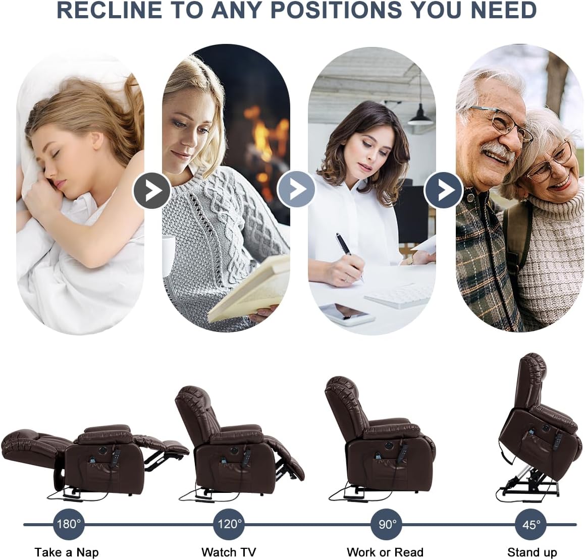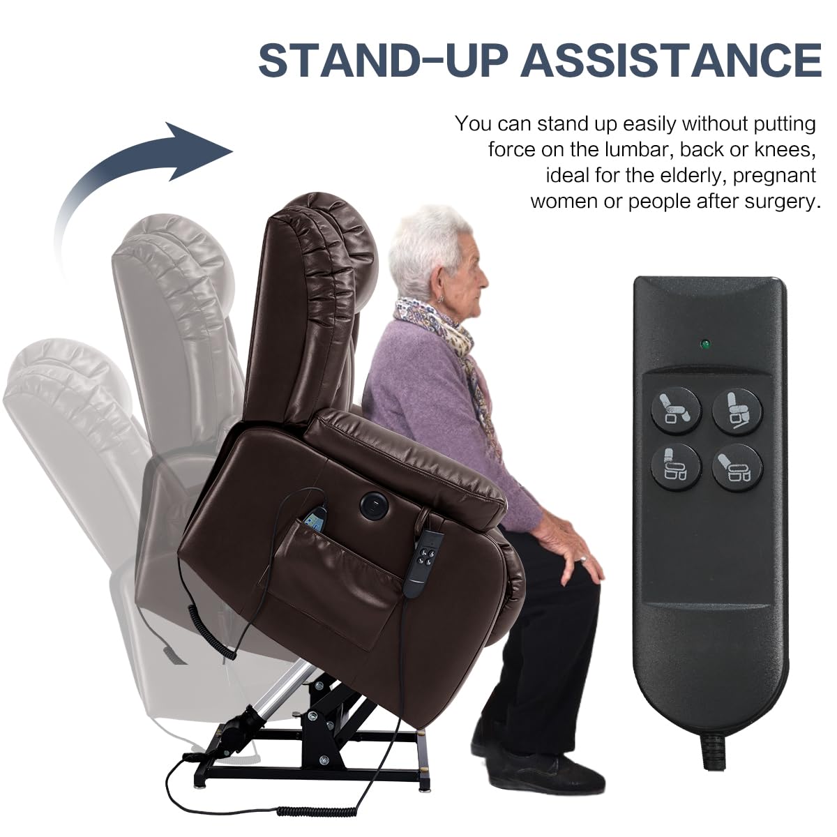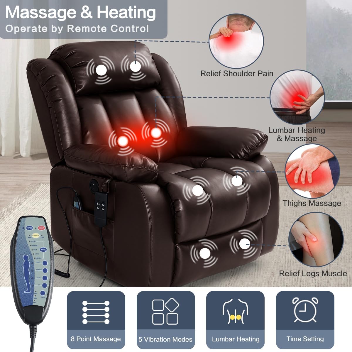 - UPGRADE MASSAGE & HEATING Power lift recliner comes with 8 vibration nodes that targets your back, lumbar, thighs and legs. Besides,there are 5 vibration massage modes and 3 intensities options. You can enjoy a personalized full-body massage experience at home. The lumbar heating function helps reduce fatigue by reducing pressure and improving blood circulation in the lumbar.