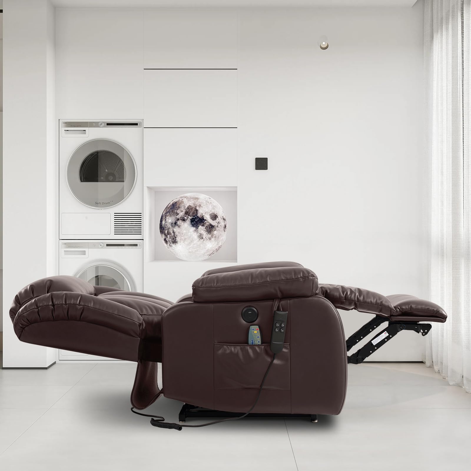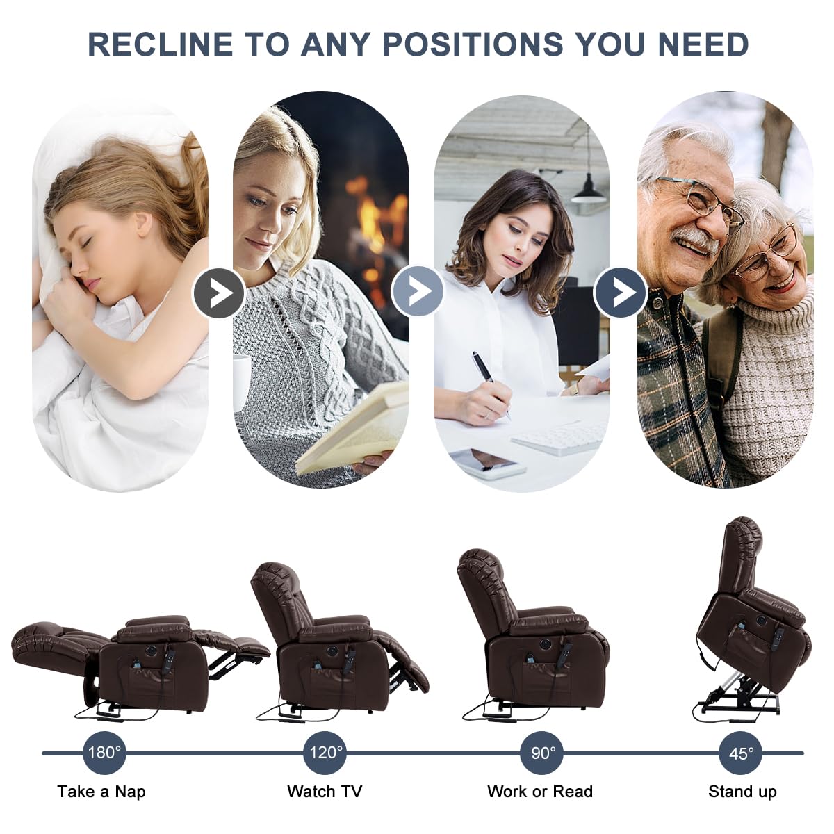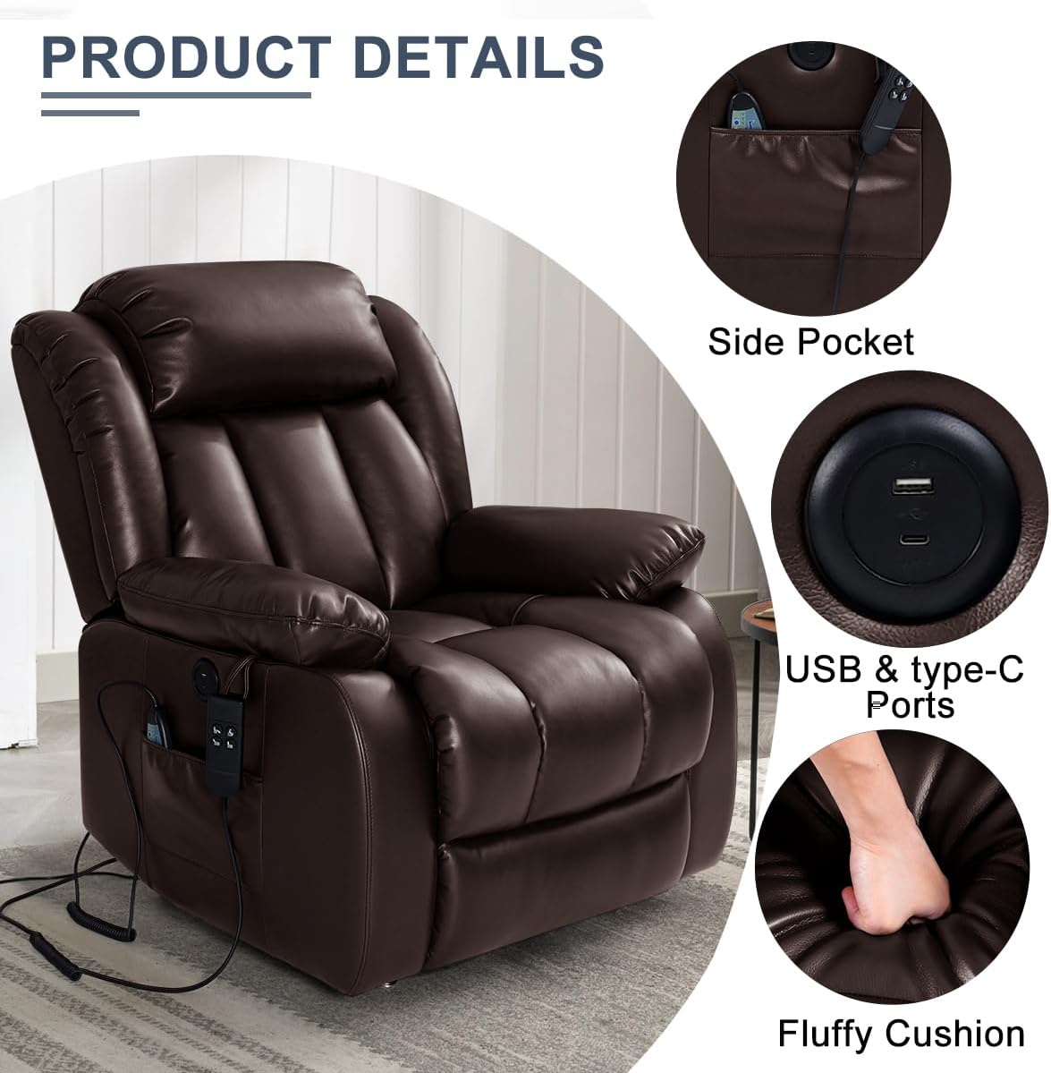 - UPGRADE MASSAGE & HEATING Power lift recliner comes with 8 vibration nodes that targets your back, lumbar, thighs and legs. Besides,there are 5 vibration massage modes and 3 intensities options. You can enjoy a personalized full-body massage experience at home. The lumbar heating function helps reduce fatigue by reducing pressure and improving blood circulation in the lumbar.
