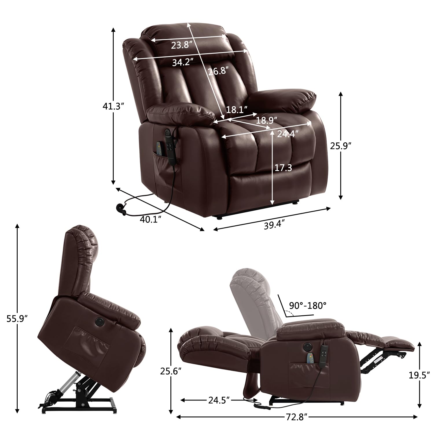 - HUMANISTIC DESIGN Comes with 2 remote controls, all operations can be easily done when you lying the recliner. Wider Armrests, thoughtful storage space and USB charge port offer more comfortable feelings. Measure 39.4"D x 40.1"W x 41.3"H, Seat Height: 19.7", Seat Width: 24.4". Weight Capacity: 350lbs. Applicable size: 5'1" - 6'2". 2 side pockets of the lift recliner chair keeps remotes and other small items. Great for seniors, leg injuries, pregnant women and mobility issues.