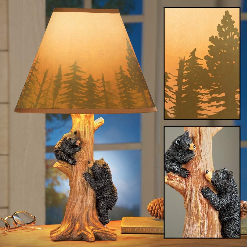 - The lamp base features an intricately-carved tree trunk being climbed by two detailed black bears