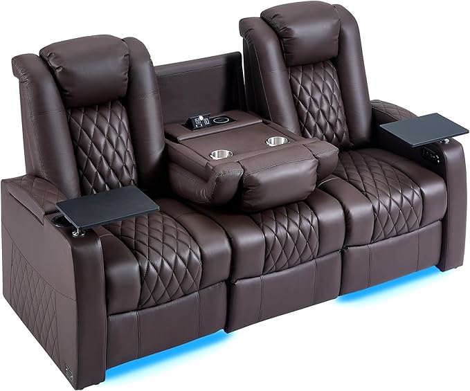 - RICH FEATURES: Equipped with a swivel tray table, armrest storage, LED cup holder and base lighting, USB and Type-C charging ports, meeting all your entertainment and relaxation needs. Lift the middle seat‘s headrest then pull down on the backrest to open the Fold-Down Table, but this seat is not electric adjustable, and without base lighting