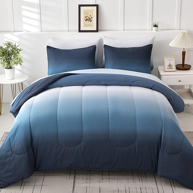 - This bedding comforter set features a beautiful gradient design that will add a touch of modern elegance to your bedroom decor. Brighten up your room with our gradient navy blue and white solid comforter set. The soft touch feel is perfect for year-round comfort and gives you a breathable and relaxing feeling in all seasons