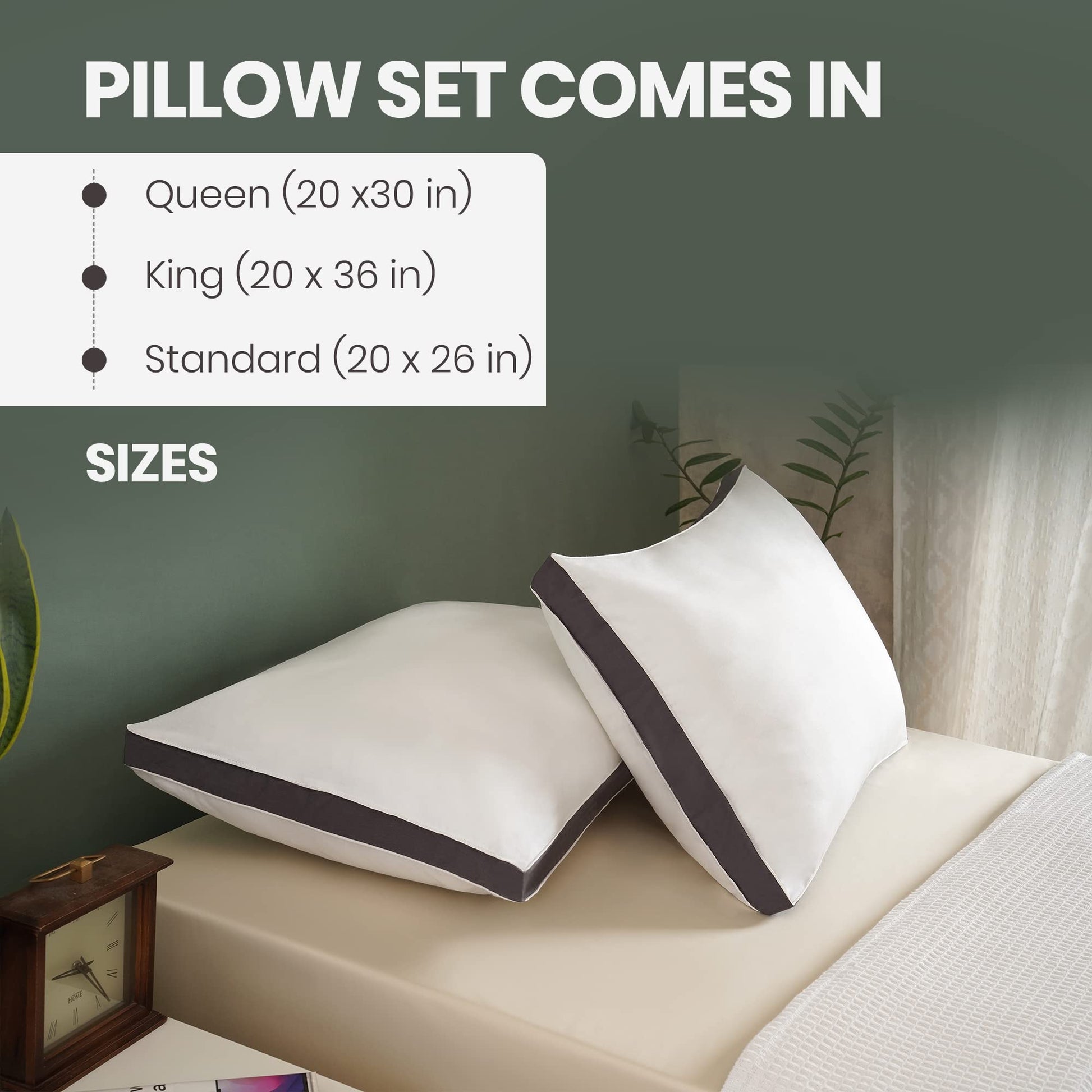 - PERFECT SIZE - The standard pillows set of 2 measure 20 x 26 inches. Our pillows are vacuum-packed for shipping. Once opened, they'll start to fluff up and reach their full size in 24 hours. Please leave 24 hours for the pillow to get to full thickness before using it.