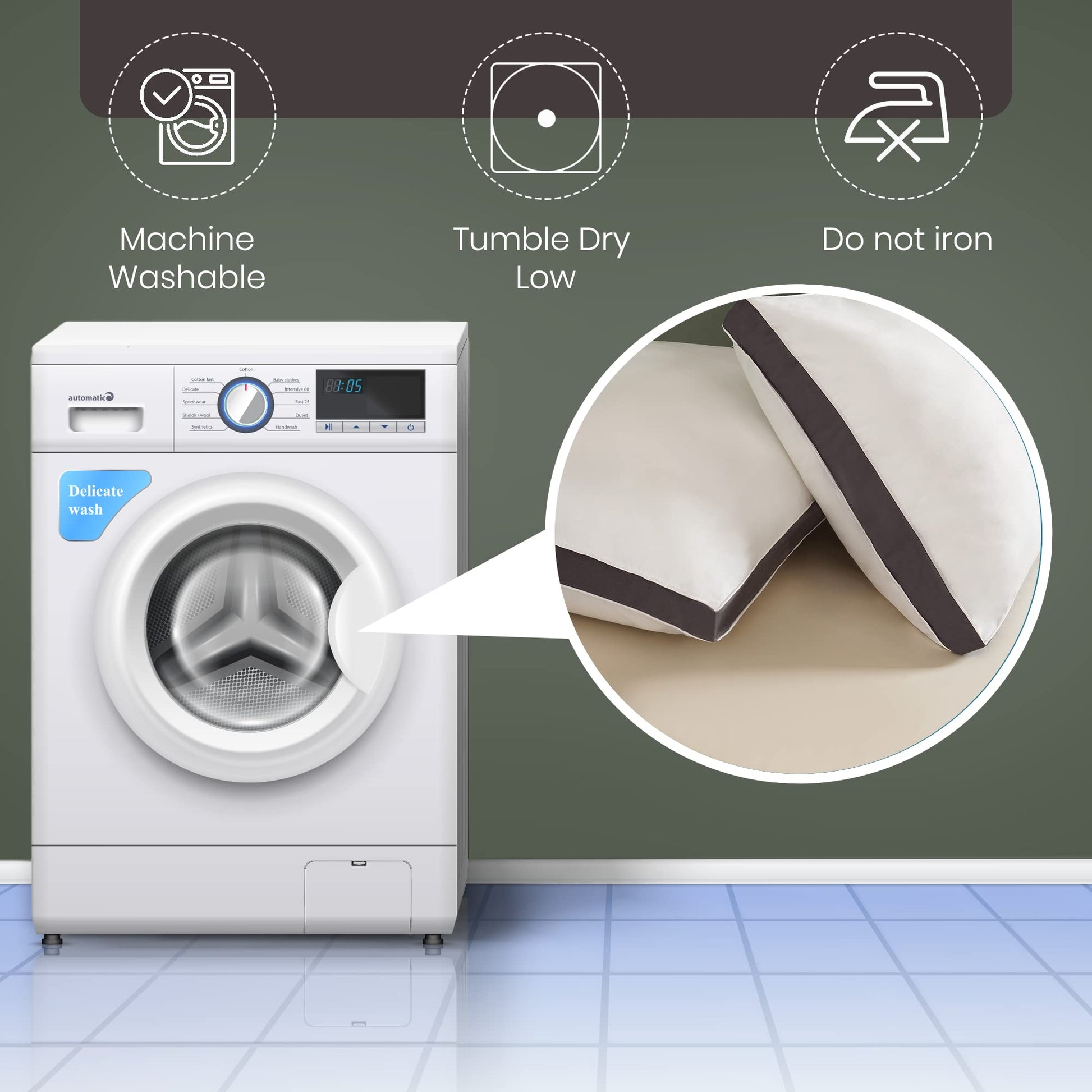 - MACHINE WASHABLE - Unlike the normal pillows pillows are machine washable, so you don't have to worry about them getting dirty or smelly. Simply throw it in the washing machine and let it do its thing! Tumble dry low. Do not iron. Do not dry clean.