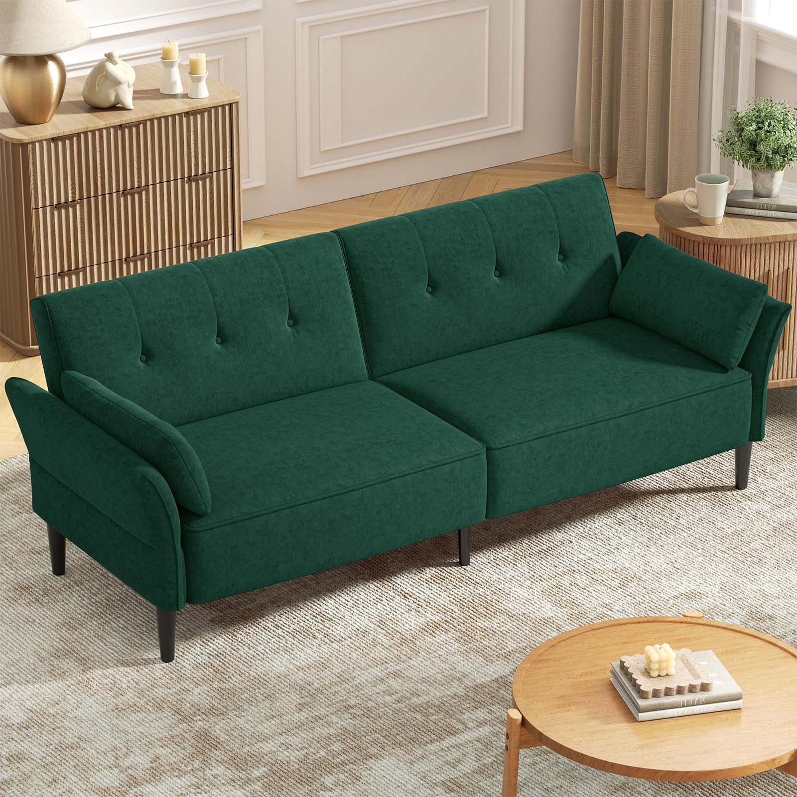 89” Futon Sofa Bed, Velvet Fabric Comfy Futon Couch Bed with 2 Square Pillows