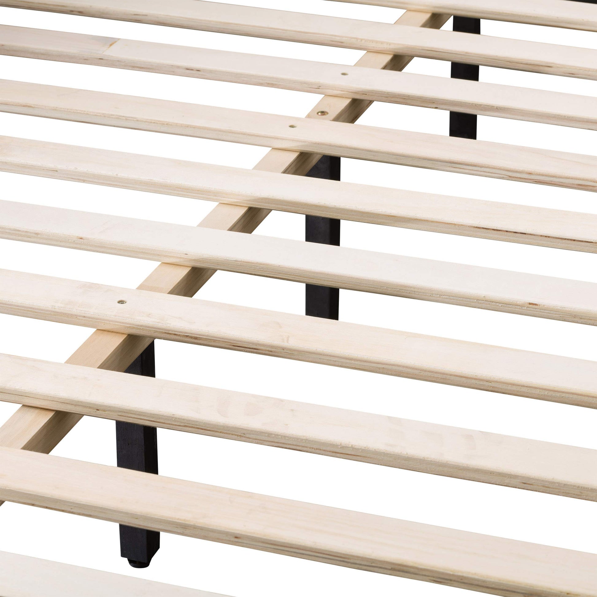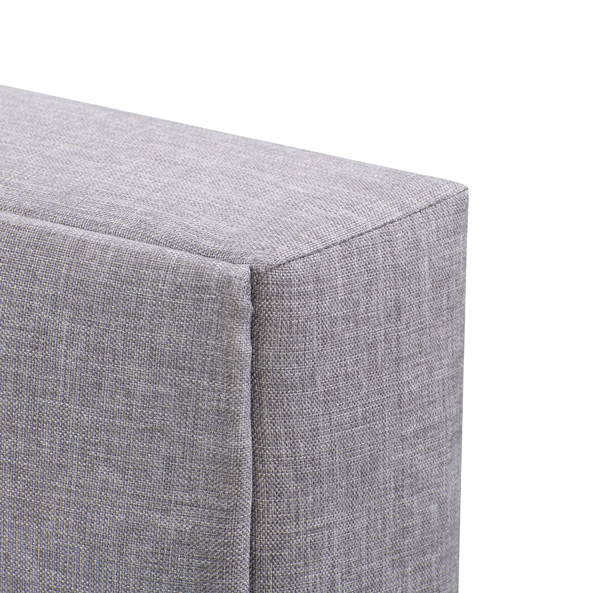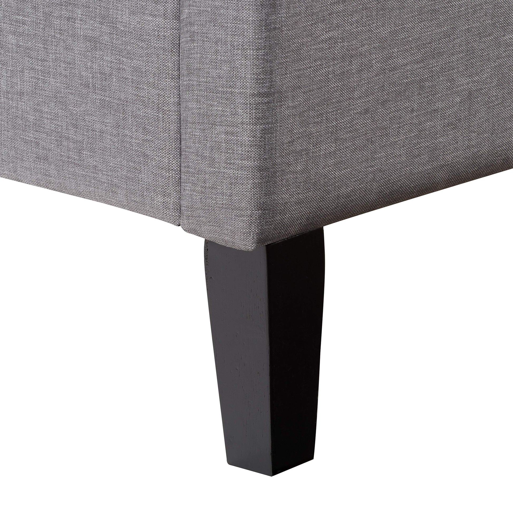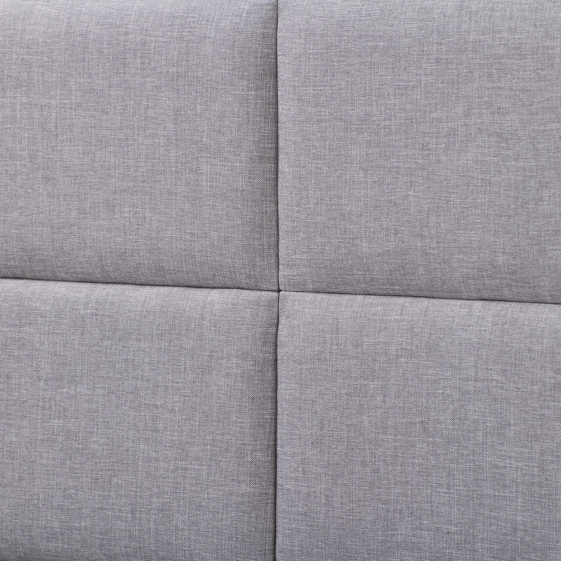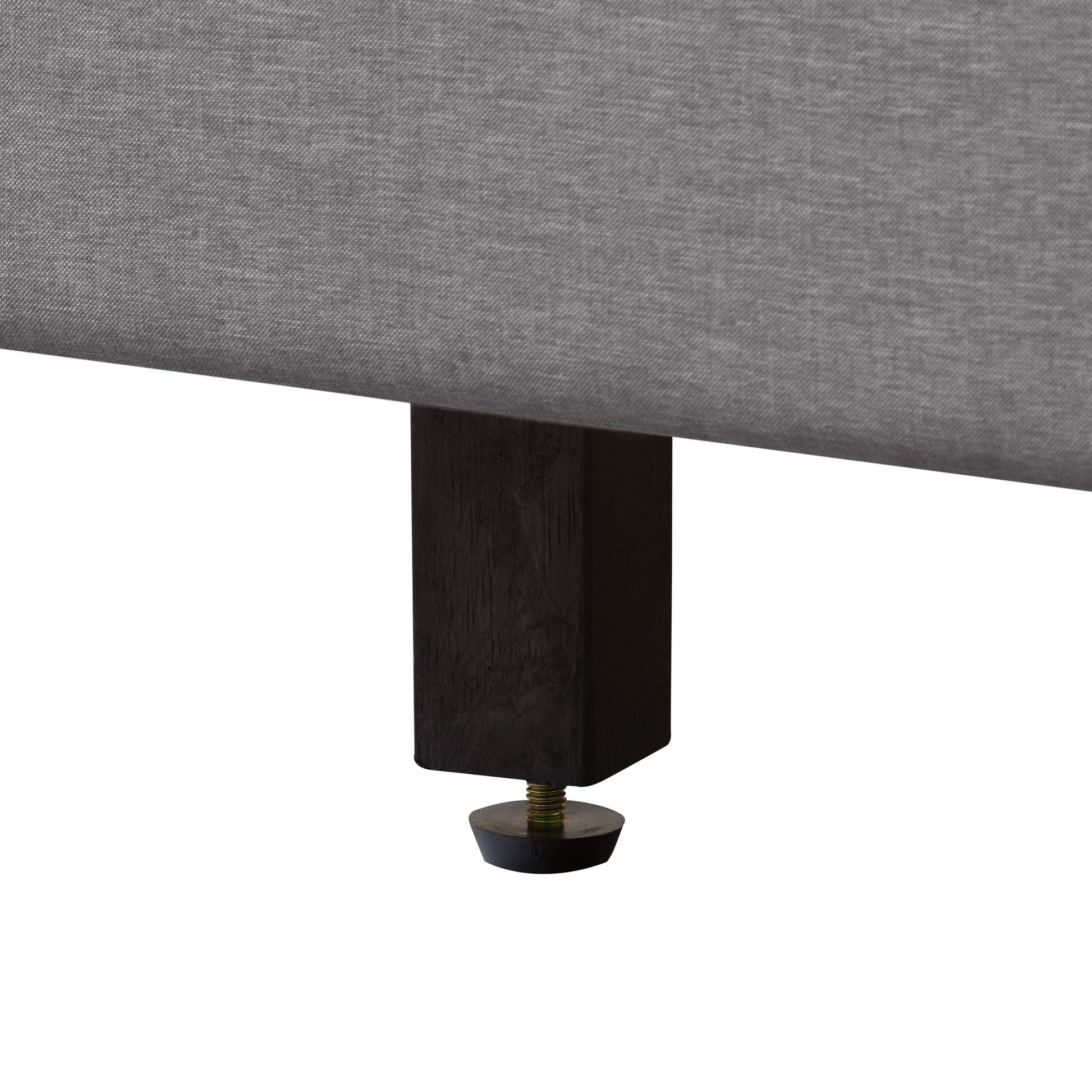 - Padded headboard and bed frame upholstered in soft light gray fabric