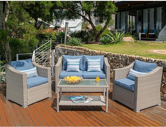 - Compact Yet Comfy: We carefully hand weave all-weather synthetic PE resin wicker around steel frames for natural warmth and beauty. The comfort is elevated by 4-inch thick high-density foam seat and back cushions and four cute teal pattern pillows. We've even included a roomy glass-top coffee table perfect for serving food, which just a Francy way of saying " munchies!"