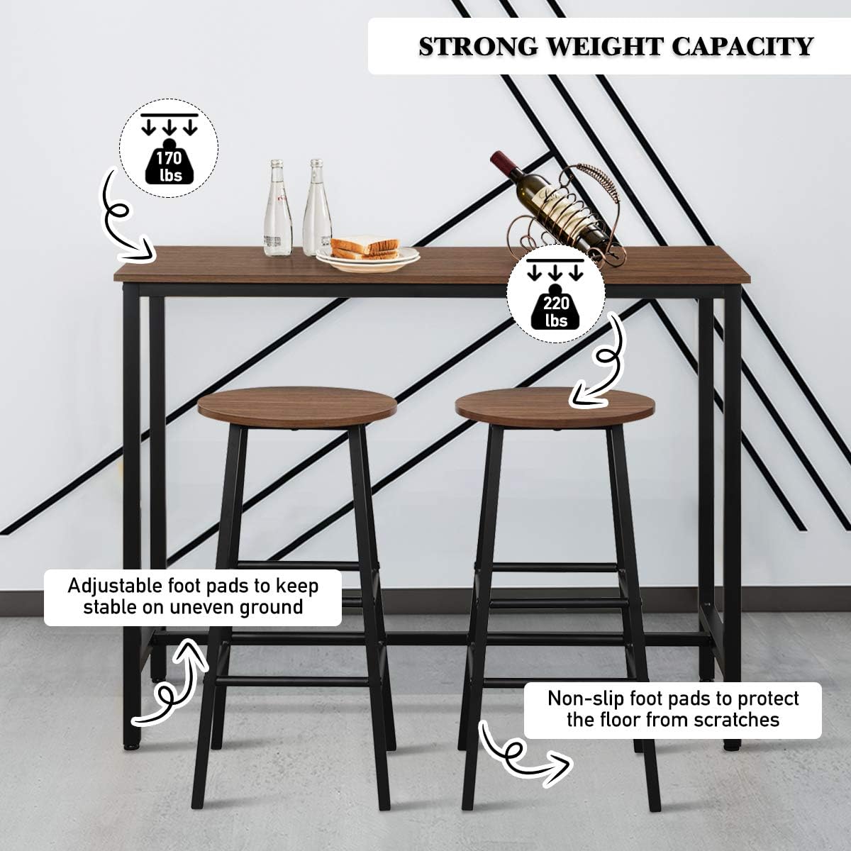 - This pub table set is made of premium MDF and sturdy metal frame, which is corrosion-resistant and durable for a long lifespan. The legs are connected by horizontal rods to enhance its stability. Each stool can bear up to 220 lbs without wobbling.
