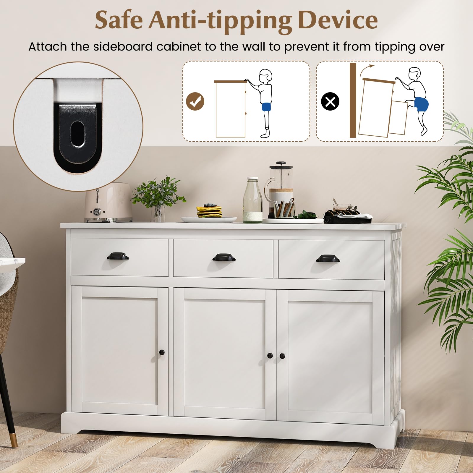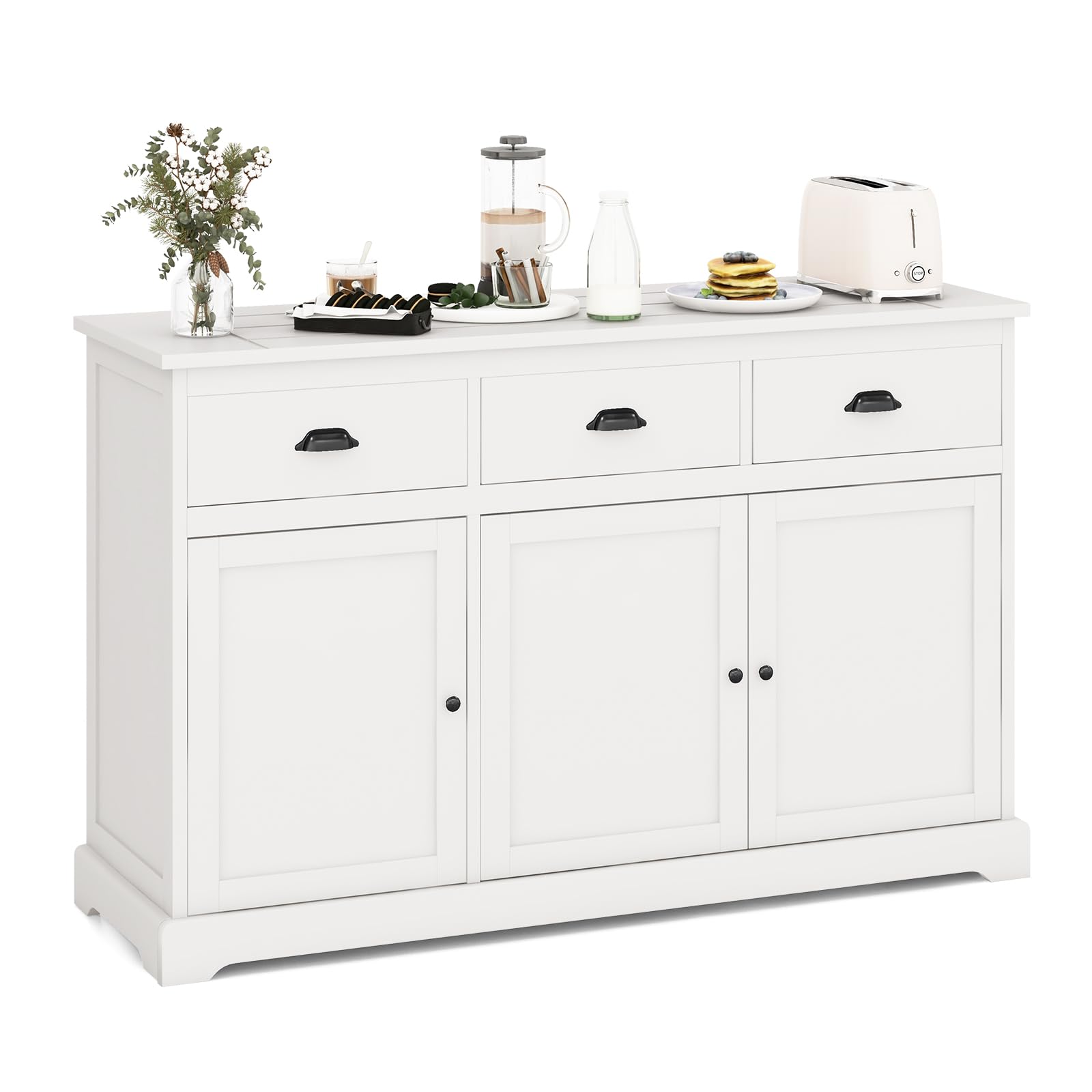 - The buffet sideboard offers ample storage with its spacious tabletop, 2 cabinets, and 3 drawers. This allows for convenient classified storage and organization. You can display decorative crafts and plants on the top surface, while safely keeping tableware, shoes, books, and daily necessities in the cabinets.
