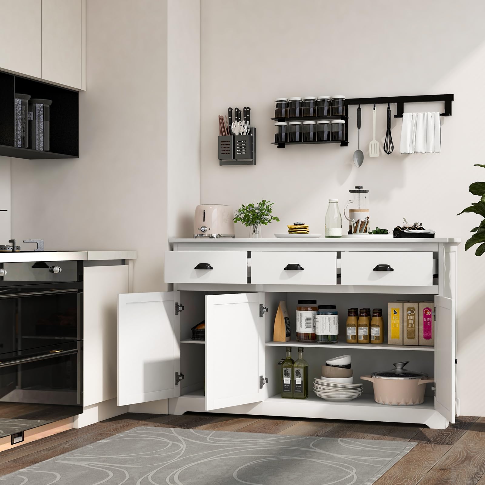 - Our kitchen buffet features a simple and elegant white finish, adding a touch of sophistication to any home style. It can be used as a storage cabinet in the living room or as a cupboard in the kitchen. This kitchen storage cabinet is perfect for the bedroom, entryway, hallway, and more.