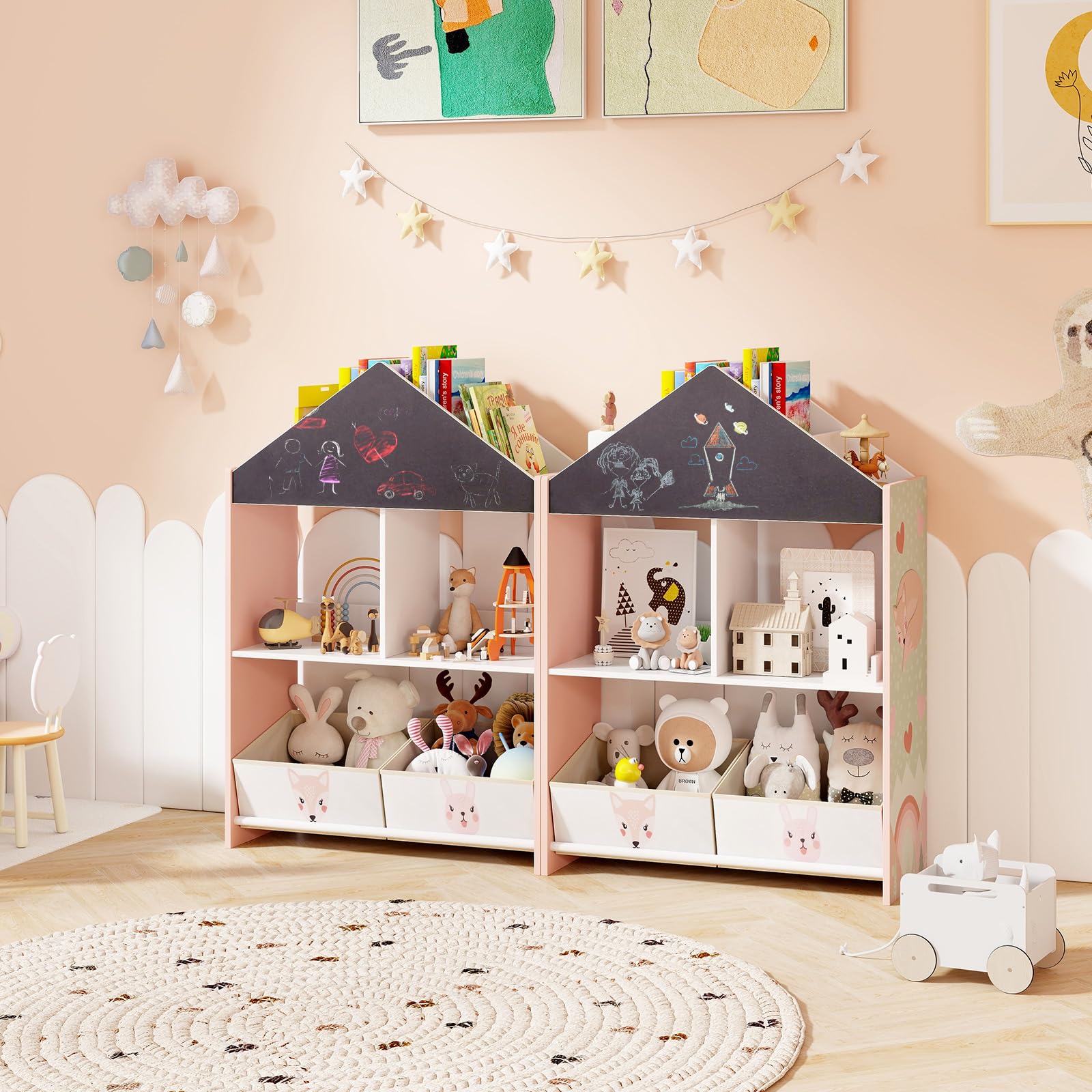 Bookshelf, Wooden Dollhouse Bookcase with Blackboard, Whiteboard, Toddler Book Shelf with Cubby & 2 Fabric Bins, Toy Storage Organizer for Kids Room, Playroom, Nursery (Pink)