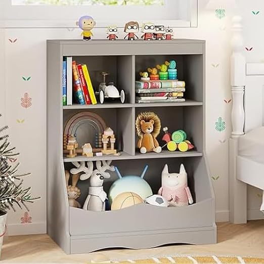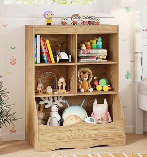 - Our kids bookshelf and toy storage presents a spacious tabletop, 4 compartments, and 1 large storage bin, offering extensive space for toys, clothes, books, and decorations. Encourage your children to develop good storage habits and create a clutter-free environment by themselves.