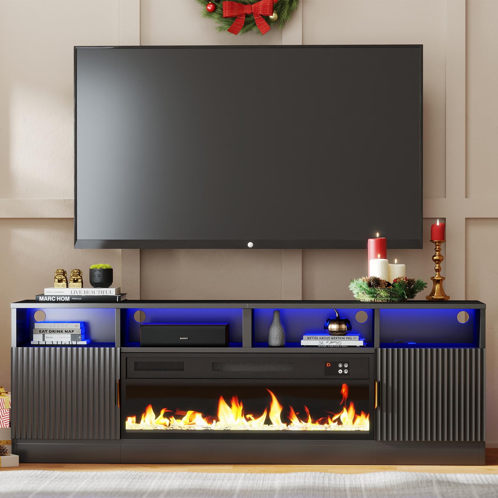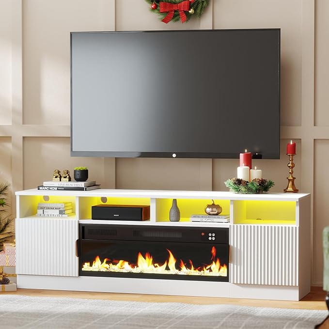 - Storage Space & Hold 70/75/80" TV: The fireplace entertainment can hold up to 80 inch flat-screen TVs. 2 soft-closing side doors and the open shelves provide plenty of storage for your equipment, games, and books