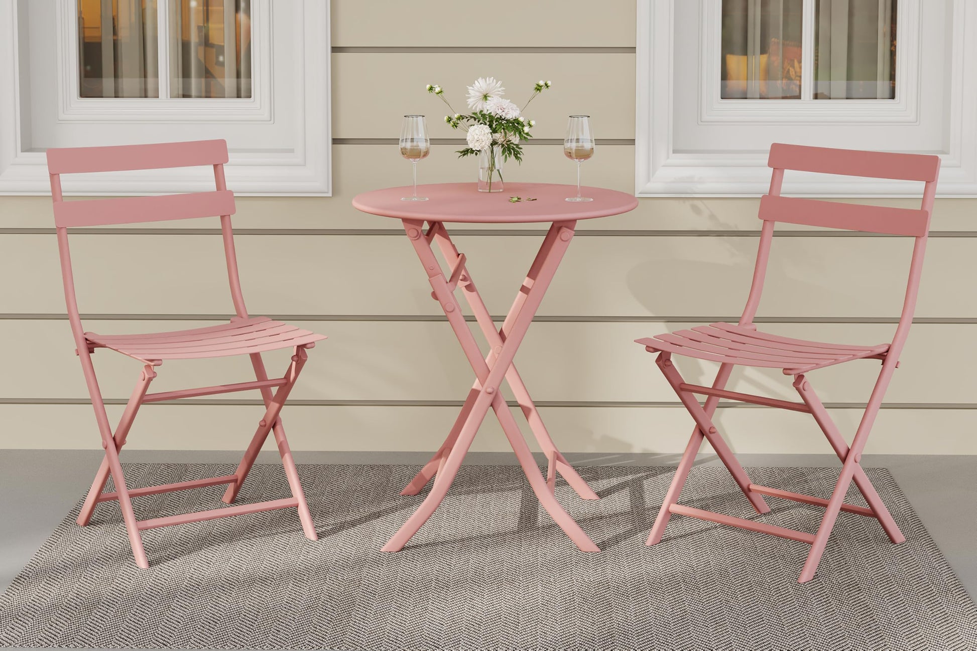 - Our 3-piece French bistro cafe patio set comes in six vibrant colors: classic black, sunny yellow, vibrant blue, mint green, pink, and white. The two folding chairs feature a durable powder-coated finish for long-lasting rust resistance and are made from sturdy round tube material for enhanced strength and stability. Foldable and space-saving, these chairs easily store away when not in use.