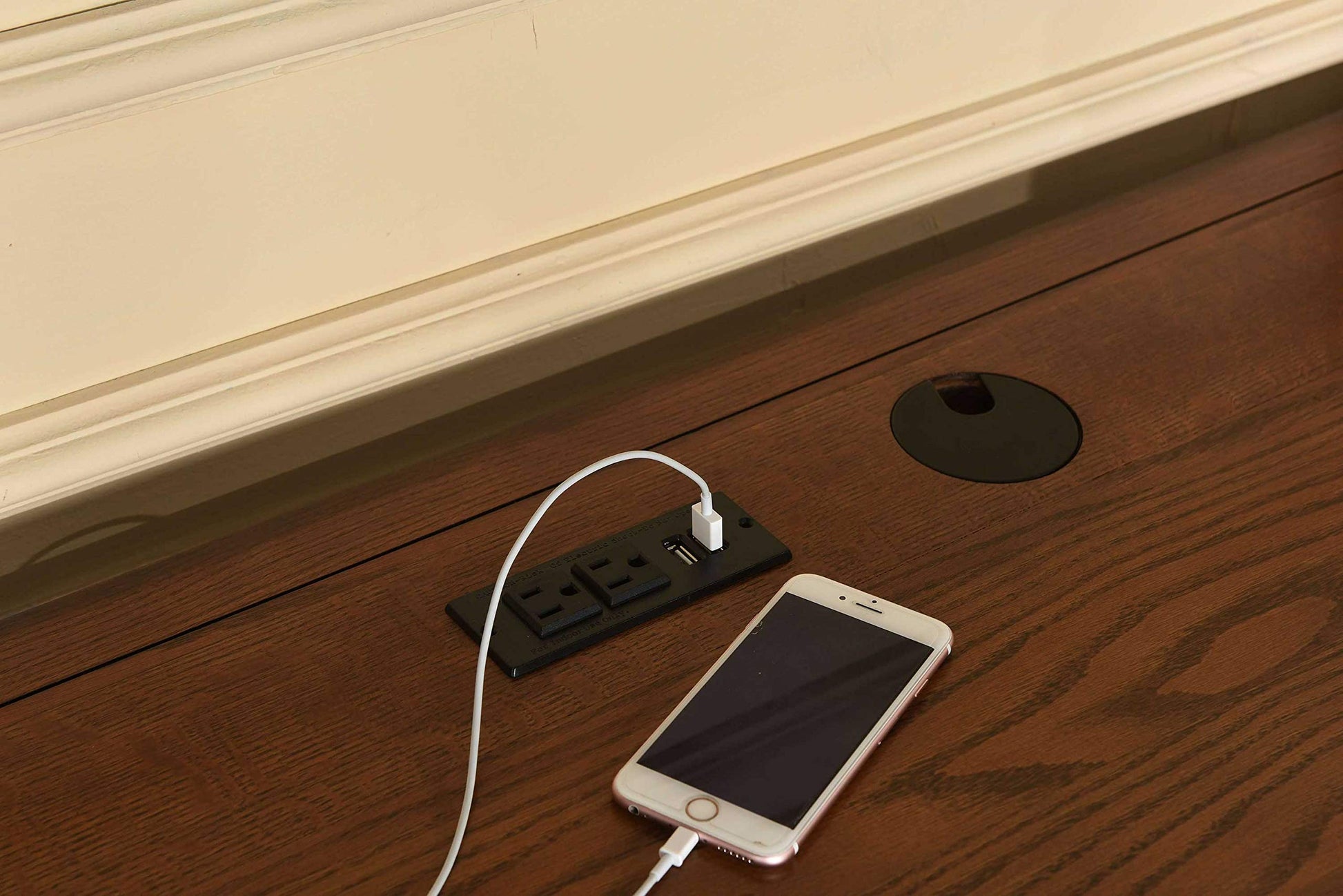 - Built In Electrical Panel on Desk Top for two three prong electrical plugs and two USP ports