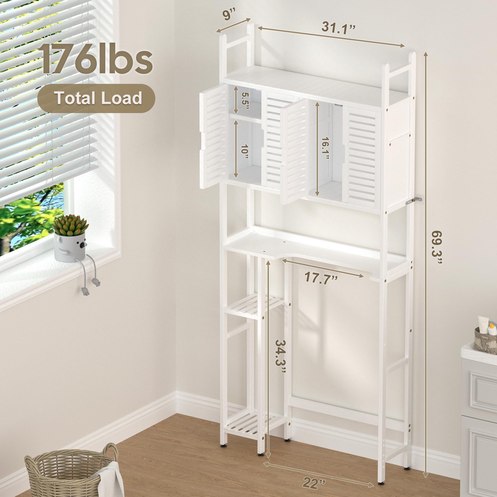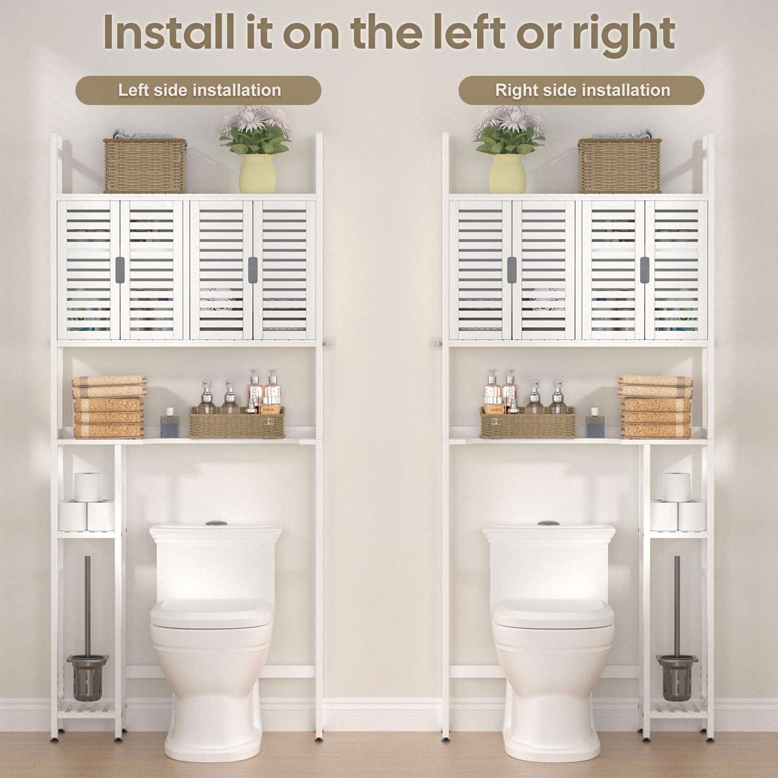 Cozivolife Over The Toilet Storage Cabinet with Toilet Paper Holder Stand,Bamboo Bathroom Organizer Shelf with Four Door and Waterproof Feet Pad,Space Saver Storage Rack with Anti-Tip Design (White)