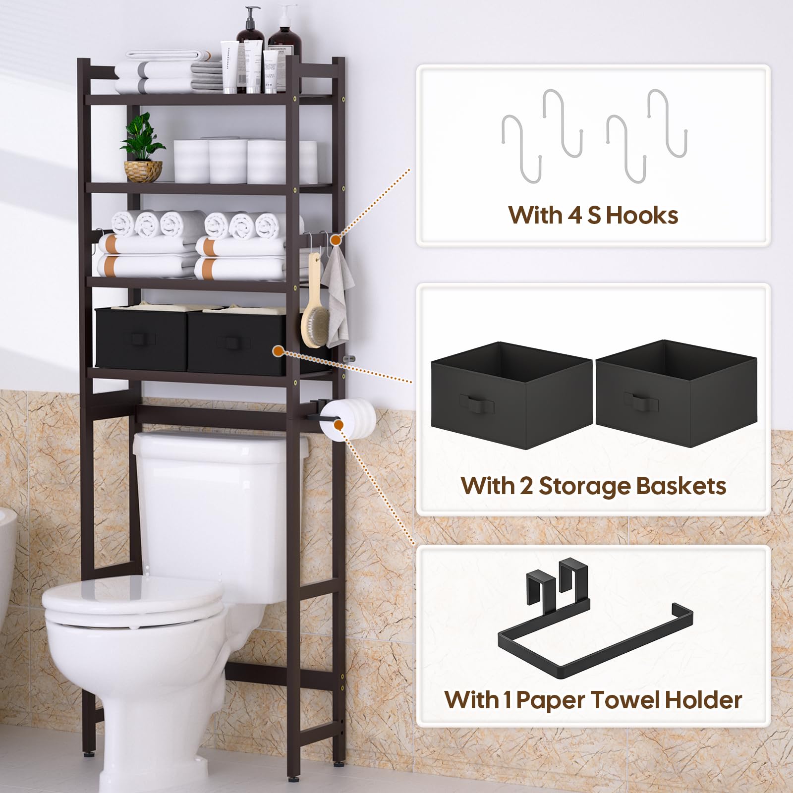 Cozivolife Over The Toilet Storage with 2 Baskets,4-Tier Bamboo Over Toilet Organizer Rack with Paper Holder & 4 Hooks & Waterproof Feet Pad,Freestanding Above Toilet Shelf for Bathroom(Brown)
