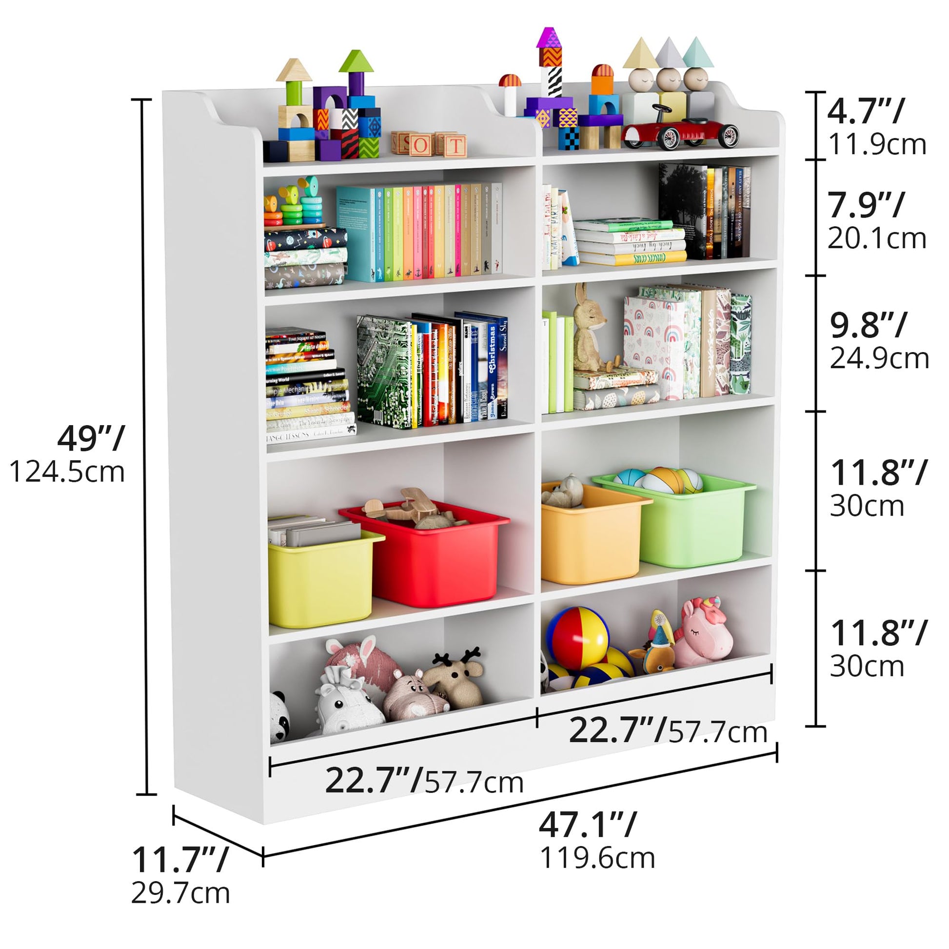 - Kids Storage Cabinet Say goodbye to cluttered spaces! With a 5-tier design and 8 open cubes, our Kids Bookshelf provides ample room for all your child's favorite books, toys, and more. It's the ultimate storage solution for a tidy and organized space.