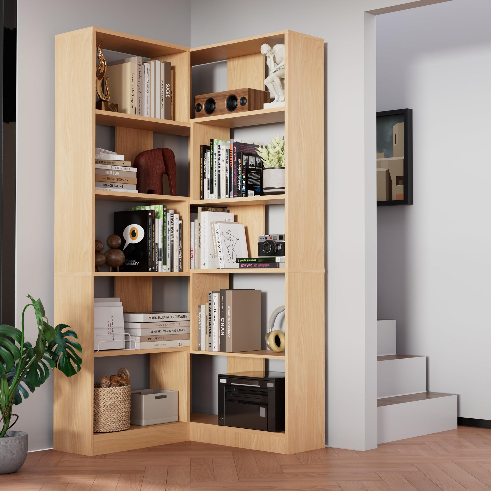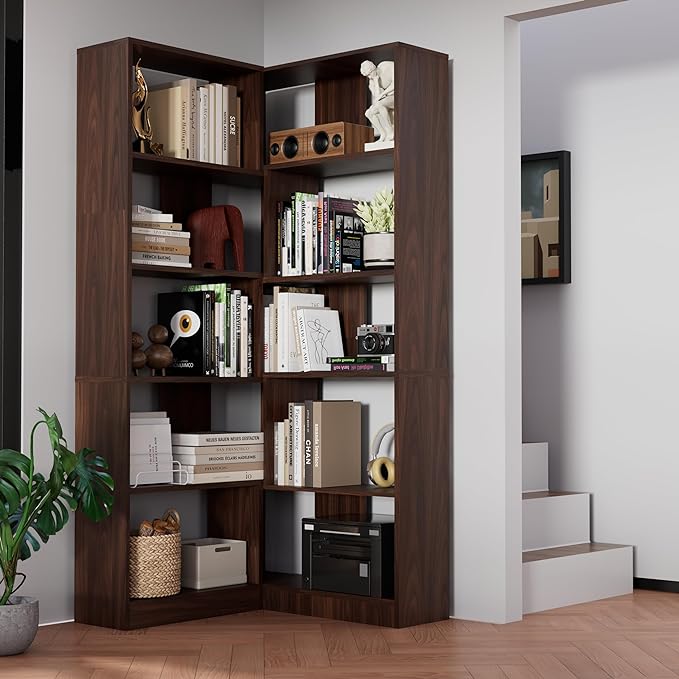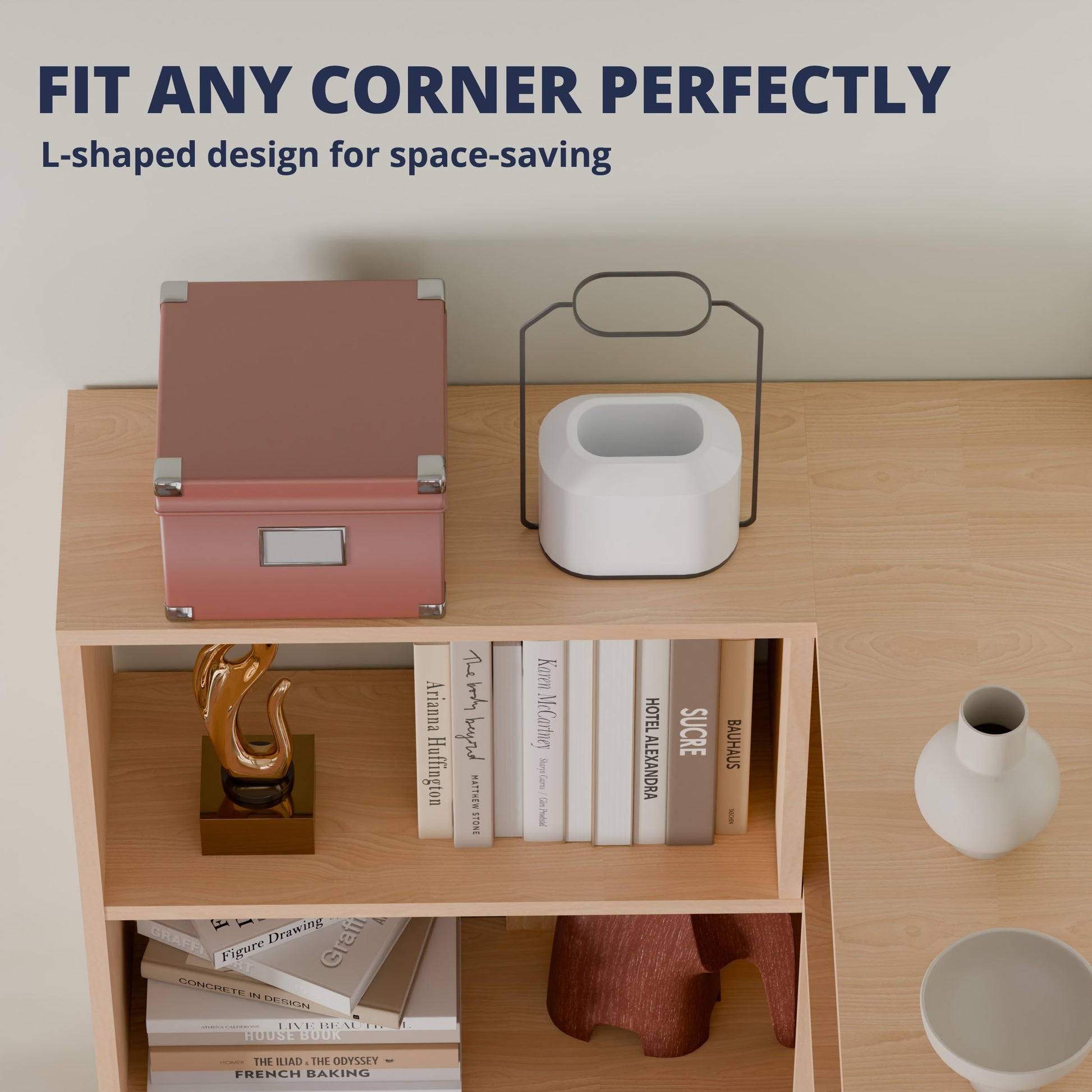 - LShaped Design for Space-SavingOur Corner Shelf features an L-shaped design to perfectly fit the wall maximizing the value of the corner for you and increasing space utilization. In addition, it is equipped with intimate panels on the sides, which can reinforce the Corner Bookcase while preventing items from falling, and allowing it to store things safer and cleaner.